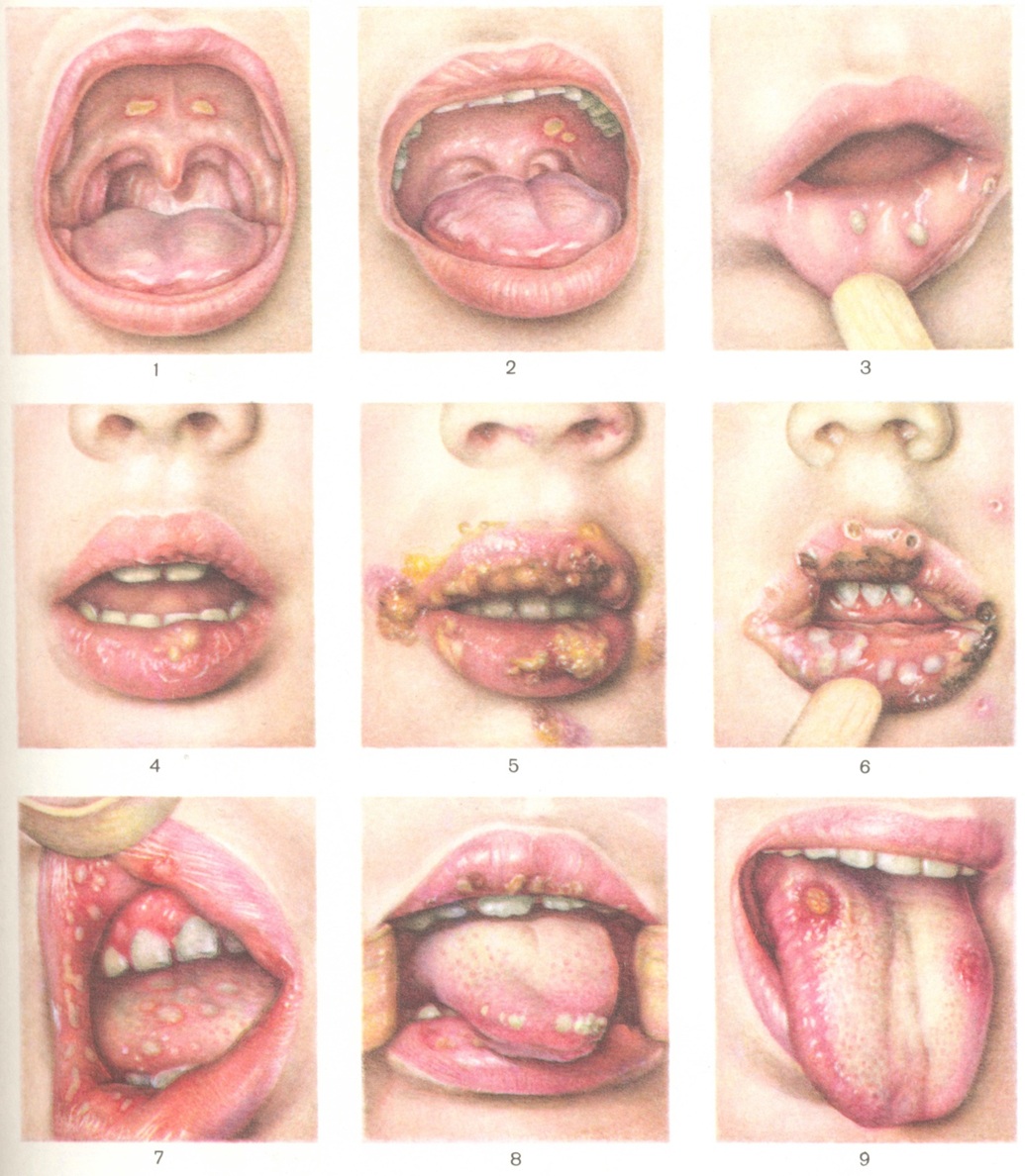 Клиническая картина. Величина афты — от булавочной головки до 5 мм в диаметром, форма округлая или овальная. Количество афты зависит от формы заболевания; так, при герпетическом стоматите на слизистой оболочке рта при легком течении наблюдается 1—5 афты, при среднетяжелом — до 20, при тяжелом — может достигать 100. Поверхность афты покрыта желто-белым налетом; длительность их развития при остром стоматите — от 5 до 10 дней, при хроническом — до 30 дней. Заживают афты, не оставляя на слизистой оболочке рубцов.