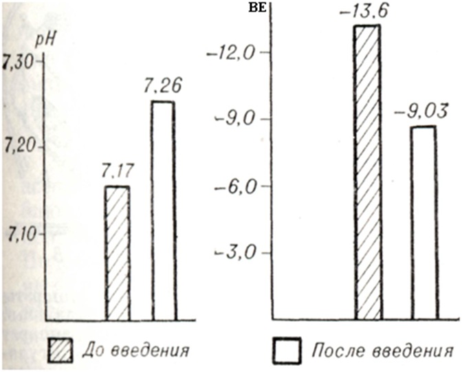 Метод Персианинова оказывает положительный эффект немедленно. Кожа ребенка становится ярко-розовой, появляется дыхание и крик. Если положительный результат получить не удалось, то следует сейчас же начинать аппаратное искусственное дыхание. Методы Легенченко и Персианинова могут использоваться также в сочетании один с другим. Методика Неговского: после освобождения дыхательных путей производят интубацию трахеи и приступают к искусственной вентиляции легких. Последнюю можно производить и с помощью маски для новорожденных с резиновым надувным обтуратором, соединяя с ней дыхательный аппарат (рисунок 8). Применяя аппаратную искусственную вентиляцию, следует правильно и бережно производить интубацию новорожденного, учитывая опасность травмирования дыхательных путей и ошибочной интубации пищевода. Искусственная вентиляция при отсутствии спонтанных дыхательных движений у ребенка проводится под давлением 35—40 сантимертов водного столба. После расправления легких и установления хороших экскурсий грудной клетки введение воздуха производится при давлении 20—25 см вод. ст. Превышение давления может привести к разрыву ткани легких. Последнее может наблюдаться и при вдувании воздуха изо рта в рот, которое производят без всякого контроля давления. Из-за опасности инфицирования новорожденного этим методом воздух нужно вдувать через 4—6 слоев стерильной марли. Целесообразно применять гелио-кислородную смесь (50% Не \ 50% 02). Метод эффективен, позволяет быстро расправить спавшиеся альвеолы легких у новорожденных, предупредить развитие первичных и вторичных ателектазов. Искусственную или вспомогательную вентиляцию гелио-кислородной смесью производят с помощью маски и портативного дыхательного аппарата. При асфиксии новорожденных (по шкале Апгар оценка 5 и 6) эффективны методы Легенченко и Персианинова. При белой асфиксии (оценка по Апгар 4 и менее) необходимо начинать с применения аппаратной искусственной вентиляции легких, одновременно вводя в вену пуповины щелочные растворы, а также применяя осторожно наружный массаж сердца. Чем тяжелее асфиксия, тем быстрее необходимо наладить аппаратную искусственную вентиляцию легких. При рождении детей в состоянии асфиксии необходимо наряду с общепринятыми мероприятиями по реанимации вводить щелочные растворы. 5% раствор бикарбоната натрия вводят медленно (в течение 30— 40 сек.) в вену пуповины в количестве 10—15—20 мл в зависимости от веса ребенка; при тяжелой асфиксии вводят на 5 мл больше. После введения щелочи в ту же вену вводят 10 мл 10% раствора глюкозы. Ощелачивающее действие бикарбоната натрия ведет к нормализации окислительных процессов в организме, устраняя патологический ацидоз (рис. 9). В известном проценте случаев у детей, родившихся в состоянии асфиксии, могут впоследствии наблюдаться различные по тяжести психоневрологические осложнения. Подобные нарушения у новорожденных не всегда связаны с длительностью срока асфиксии. Поражения нервной системы могут наблюдаться у оживленных в первые 10 минут и отсутствовать при оживлении через 30 минут. Ребенок, перенесший асфиксию даже в легкой степени, требует тщательного наблюдения и лечения под руководством педиатра. После тяжелой асфиксии могут наблюдаться повторные приступы асфиксии, связанные с нарастанием ацидоза, что я