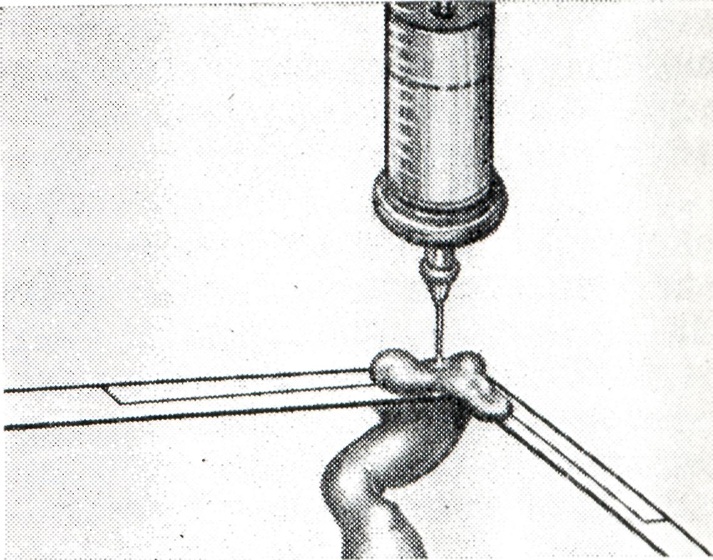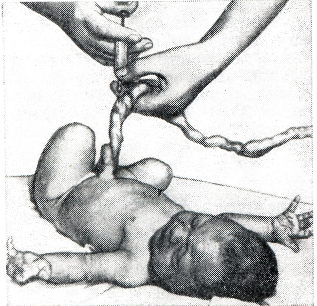 В связи с этим применение аналептиков при оживлении детей с тяжелой асфиксией должно быть ограничено. В СССР при оживлении детей, родившихся в асфиксии, применяются методы И. С. Легенченко, Л. С. Персианинова и искусственная вентиляция легких по методике, рекомендованной В. А. Неговским. Совершенно неправильно противопоставлять один метод другому или считать какой-нибудь из них универсальным. Применение методов оживления новорожденных следует начинать без всякой задержки. Независимо от того, какой метод используется при оживлении новорожденного, обязательным и первоочередным мероприятием должно быть освобождение дыхательных путей ребенка от слизи и околоплодных вод. Это производят с помощью катетера с центральным отверстием, соединенного с аспиратором (водоструйным, электрическим или педальным). Метод Легенченко заключается в том, что ребенка не отделяют от матери, учитывая, что новорожденный получает необходимый ему кислород через плацентарный круг кровообращения при неперевязанной пуповине. Матери в это время дают для вдыхания кислород. Этот метод применяют в течение не более 3—4 минут., что нередко совпадает с периодом освобождения дыхательных путей от слизи и околоплодных вод. Метод Персианинова основан на вовлечении в процесс восстановления жизненных функций организма нервнорефлекторных механизмов, начальным звеном которых является раздражение нервнорецепторного аппарата сосудистой стенки. Последнее осуществляется введением в артерию пуповины раствора хлорида кальция и глюкозы. При неперевязанной пуповине и наличии пульсации артерии стенку ее прокалывают острой иглой и толчкообразно, отдельными порциями вводят сначала раствор хлорида кальция (рис. 6), а затем раствор глюкозы. При отсутствии пульсации или если ребенок отделен от матери, край поперечного разреза пуповины захватывают зажимом Пеана. Поддерживая пальцами одной руки зажим Пеана, второй рукой вращательным движением осторожно вводят в просвет одной из артерий пуповины иглу без острия, срезанную в поперечном направлении. После введения иглы в просвет на 1,5—2 сантиметра пуповину вместе с иглой захватывают зажимом Кохера и с помощью шприца вливают раствор хлорида кальция (рисунок 7) и затем глюкозы. Применяя метод Персианинова, необходимо помнить следующее: количество вводимого 10% раствора хлорида кальция не должно превышать 3 милилитра нельзя вводить этот раствор в каких-либо смесях; раствор хлорида кальция (10%) при асфиксии вводят в артерию пуповины, а не в вену; дополнительно через ту же иглу можно ввести 40% раствор глюкозы (5—7 мл).