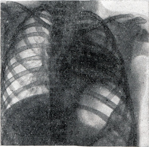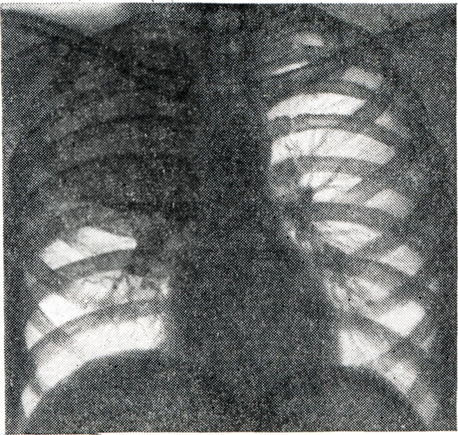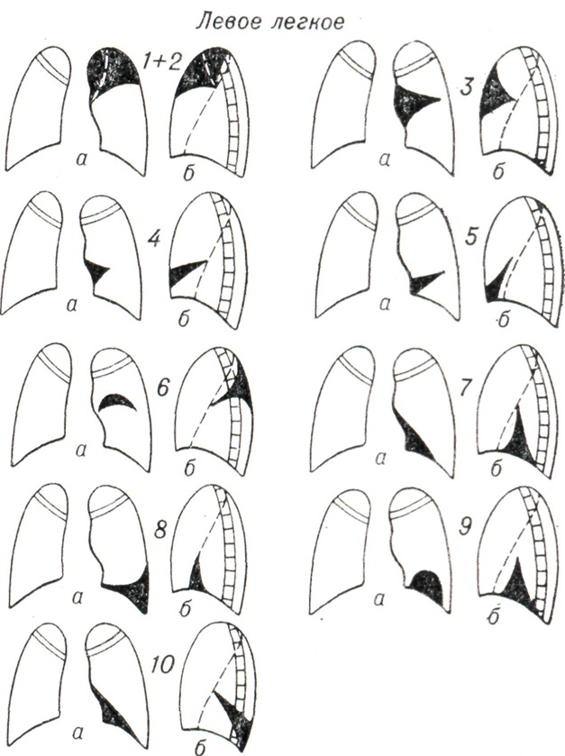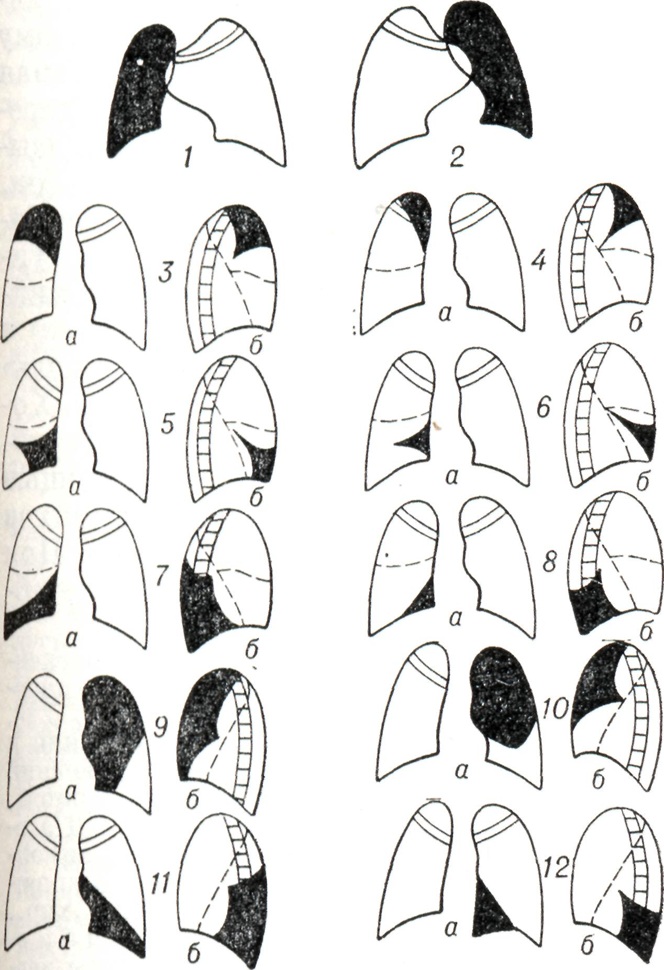 При тотальном ателектазе (рис. 3, 1 и 2) спавшееся легкое обычно уменьшено, интенсивно и равномерно затемнено. В большинстве случаев тени ребер сближены (соответственно западению грудной стенки), иногда наблюдается сколиоз грудного отдела позвоночника, выпуклостью обращенный в сторону поражения. Купол диафрагмы и тени поддиафрагмальных органов на стороне ателектаза приподняты; слева необычно высоко и медиально проецируется газовый желудочный пузырь. Срединная тень, в частности трахея, значительно перетянута в сторону ателектаза, бифуркация трахеи проецируется сбоку от тени позвоночника. Непораженное второе легкое вздуто, и его тень частично перемещена в противоположную половину грудной клетки. Такое перемещение испытывают главным образом передне-верхние позадигрудинные отделы противоположного легкого, давая в рентгенологическом отображении картину так называемой медиастинальной грыжи, то есть ограниченное дугообразной линией просветление на фоне верхне-медиальных отделов затемненного легочного поля на стороне ателектаза. Такие «грыжи» могут достигать больших размеров, в особенности при ателектазе левого легкого. Рентгенологическая картина при долевых ателектазах типична (рис. 3, 3—12). Как известно, доли легких как бы фиксированы в двух местах: у корня и из-за отрицательного внутриплеврального давления у грудной стенки. В силу эти особенностей спадение и перемещение долей легких при ателектазе происходит в случае отсутствия плевральных сращений закономерно в определенном направлении. Верхняя доля правого легкого смещается при ателектазе кверху, кнутри и кпереди в направлении передне-медиальных отделов грудной клетки. Нижняя граница тени спавшейся доли (линия малой междолевой щели) перемещается кверху, задняя (линия главной междолевой щели) — кпереди. На боковой рентгенограмме определяется треугольная тень с несколько втянутыми гладкими контурами, вершина которой примыкает к тени корня, а основание — к грудной стенке. На фоне этой тени хорошо видна линия косой междолевой щели, переместившейся кпереди. При нарастающем спадении доли последняя приближается к грудной стенке и исчезает. Спадение верхней доли может быть столь значительным, что на прямой рентгенограмме ее тень представляется узкой боковой полоской у средостения, а в боковой проекции — симулирует уплотнение легочного сегмента. Ателектаз верхней доли сопровождается расширением нижней и средней долей, наибольшему вздутию подвергаются задне-верхние отделы нижней и верхне-передние отделы средней доли. Тень корня легкого перемещается, как правило, кверху. При ателектазе правой верхней доли, как и при ателектазах других долей, наблюдаются и атипичные картины, нередко симулирующие на передней рентгенограмме картину медиастинальной «грыжи», что обусловлено главным образом плевральными сращениями, фиксирующими легкое. Рентгенологическая картина ателектаза верхней доли левого легкого отличается большим объемом, более отвесным расположением левой косой междолевой щели и не всегда четкой нижней границей тени: в части случаев она дугообразно втянута. Средняя доля при ателектазе смещается кнутри и кпереди. Верхняя граница ее перемещается книзу, нижняя, соответствующая косой междолевой щели, — кверху и несколько кпереди. На прямой рентгено
