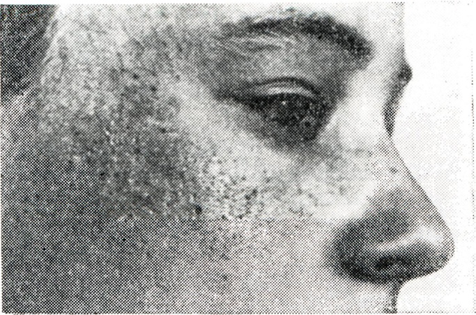 Начинаясь в молодом возрасте, атрофодермия медленно прогрессирует. На щеках симметрично появляются тесно сидящие фолликулярные мелкие пробки. В дальнейшем на их месте остаются мелкие атрофические рубчики (рис.), придающие коже щек сетчатую «изъеденность», напоминающую поверхность дерева, пораженного червоточиной.