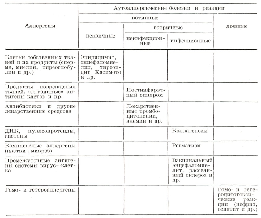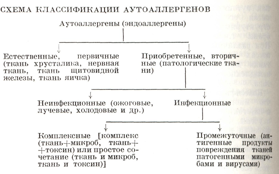 В иммунологических механизмах повреждения тканей участвуют все указанные выше четыре механизма. По характеру аутоаллергенов истинные аллергические болезни и реакции разделены на первичные и вторичные. Диагностика. Клиническим выражением напряжения иммуногенеза является увеличение лимфатических, узлов и селезёнки. Помимо типичных для каждой аутоиммунной болезни клинических признаков, большое значение для диагностики придается выявлению аутоантител в сыворотке больного. Последние могут быть выявлены различными, определенными для каждого заболевания тестами. При аутоаллергических гемолитических анемиях применяют прямой и непрямой тесты Кумбса (смотри Кумбса реакция). Для выявления противотканевых аутоантител применяют реакцию связывания комплемента, реакцию преципитации в геле по Оухтерлоню (смотри Преципитация), реакцию пассивной гемагглютинации по Бойдену (смотри Бойдена реакция). При некоторых аутоиммунных болезнях в сыворотке выявляются особые белки, по-видимому, имеющие отношение к аутоантителам, например ревматоидный фактор при ревматоидном артрите, волчаночный фактор при системной красной волчанке. Результатом действия противоядерных антител при последнем заболевании следует считать образование волчаночных (LE) клеток. Ориентировочное значение в диагностике имеет гипергаммаглобулинемия. Нередко, особенно в диагностике коллагенозов, применяется анализ материала биопсии тканей. При многих аутоиммунных болезнях можно получить положительную кожную аллергическую реакцию замедленного типа на соответствующий тканевой гомоантиген. Однако широкого применения в клинической практике этот метод пока не получил. Прогноз. Наиболее общей чертой большинства аутоиммунных болезней является их тяжелое прогрессирующее течение, приводящее к необратимым нарушениям функции соответствующего органа или системы. Исключение составляют некоторые лекарственные гемопатии, имеющие благоприятный прогноз при отсутствии повторных контактов с соответствующими лекарствами. Введение в терапию аутоиммунных болезней кортикостероидов значительно продлило жизнь многих больных. Принципы лечения. Практически при всех аутоиммунных болезнях приходится прибегать к лечению кортикостероидными гормонами, которые действуют как на основной механизм развития болезни, подавляя продукцию аутоантител, так и на вторичные изменения благодаря противовоспалительному действию и замещению недостатка эндогенных кортикостероидов. Схемы лечения различны для каждого заболевания. Как правило, необходимо длительное лечение в сочетании со средствами, снижающими возможность развития побочных реакций. Благоприятные результаты достигнуты, в частности, при комбинированном лечении кортикостероидами в сочетании с производными хинолина (делагил, резохин и другими). При установлении диагноза лекарственных гемопатии необходимо прекращение контакта с антигеном (гаптеном). При идиопатических формах гемолитической анемии и тромбоцитопении в ряде случаев показана спленэктомия. В последние годы изучается вопрос лечения аутоиммунных болезней цитостатическими препаратами (новэмбихин, тиоТЭФ и другими) и иммунодепрессантами типа 6-мер-каптопурина. Профилактика. В связи с неясностью многих вопросов этиологии и патогенеза аутоиммунных 