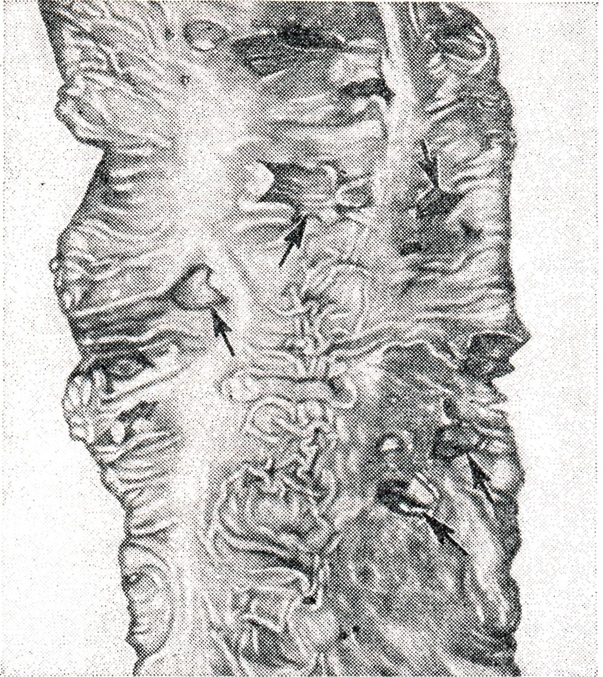 При колите, обусловленном Б., стенка кишки отечная, дряблая, гилеремированная. На слизистой оболочке обнаруживаются язвы разной величины и конфигурации (рис. 2), обширные язвенные поля в несколько квадратных сантиметров. Края язв неровные, подрытые, утолщенные, располагаются они по длиннику складок слизистой оболочки; на дне язв остатки рыхлых или полужидких некротических масс, имеющие, как и отдельные участки слизистой оболочки, аспидно-черную окраску.