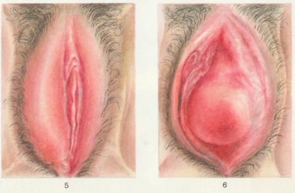 Клиническая картина. Обычно вначале развивается воспаление выводного протока большой железы преддверия — каналикулит. При этом появляется в небольшом количестве слизисто-гнойный секрет, незначительное уплотнение, болезненность и покраснение вокруг наружного отверстия протока, что известно под названием гонорейного пятна (однако это пятно может быть и при отсутствии гонореи). Воспалительный отек ведет к быстрому закрытию наружного отверстия главного выводного протока, к задержке содержимого в нем и в образующих его мелких протоках и железистых пузырьках. Содержимое сецернирующей железы застаивается, что ведет к образованию ретенционной кисты, а при нагноении — ложного абсцесса бартолиновой железы (цветн. табл., рис. 5). По генезу ложные абсцессы бартолиновой железы можно разделить на первичные — как исход гнойного каналикулита — и вторичные, возникающие в результате нагноения ранее существовавшей ретенционной кисты. Истинный абсцесс бартолиновой железы (цветн. табл., рис. 6) — вовлечение в процесс ткани самой железы с окружающей ее клетчаткой — наблюдается редко.