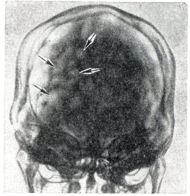 Иногда наблюдаются эпилептические припадки. Отмечены нарушения психики, в редких случаях — слабоумие. Могут быть патологические рефлексы, атаксия, эндокринно-обменные и вегетативные нарушения. Сочетание Б.ч. с прогнатизмом, экзофтальмом, нистагмом, умственной отсталостью, эпилептоидными приступами, атрофией зрительного нерва описывается как синдром Терсиля. Могут быть стационарные (компенсированные) и прогредиентные формы Б. ч. На краниограмме отмечается отсутствие черепных швов в сочетании с Б. ч., наличие выраженных пальцевых вдавлений (рис.), укорочение и западение передней и средней черепных ямок, булавовидная спинка турецкого седла.