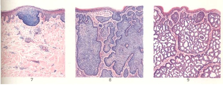 Патологическая анатомия. Макроскопически Б. имеет вид либо плоской бляшки, узелка, либо поверхностной язвочки, а иногда обширного глубокого изъязвления с темнокрасным дном. Микроскопически для Б. характерно образование тяжей и комплексов, состоящих из мелких, интенсивно окрашенных клеток. Образуемые клеточные тяжи и комплексы по периферии обычно ограничены призматическими клетками с базально расположенными ядрами, длинные оси к-рых располагаются перпендикулярно к границе тяжа или комплекса, а клетки группируются параллельно друг другу. Клетки содержат небольшое количество цитоплазмы и темные округлые овальные или вытянутые ядра. Они напоминают клетки базального слоя эпителия кожи, но лишены межклеточных мостиков. Внутри тяжей и комплексов клетки имеют меньший размер, располагаются беспорядочно и более рыхло. В клетках Б. встречаются преимущественно правильные митозы и редко атипичные.