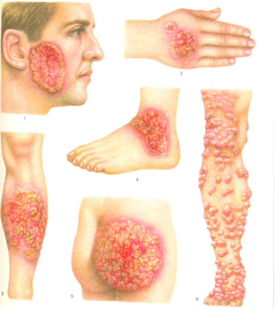При генерализации процесса аналогичные изменения находят в печени, селезенке, почках и других органах. Нередки абсцессы в предстательной железе, маточных трубах и матке. Характерно поражение костей, к-рое обусловливает гнойные процессы в мышцах и образование подкожных абсцессов и свищей. Наблюдаются лептоменингит и абсцессы мозга. Бластомикоз Гилкриста дифференцируют с туберкулезом, в основном гистологически. При Б. наблюдаются микроабсцессы, отсутствует казеоз (или слабо выражен), значительно меньше плазматических клеток в инфильтрате, гигантские клетки Пирогова — Лангханса рассеяны по всей дерме. Большие трудности представляет дифференциация с криптокок-козом (см.), в отличие от к-рого при бластомикозе Гилкриста отсутствует выраженная зональность воспалительного инфильтрата, значительно сильнее выражены процессы нагноения и абсцедирования; возбудитель несколько больших размеров, чем криптококк, и у него нет широкой слизистой желатинообразной капсулы. Клиническая картина. Различают первичный Б. легких, к-рый может протекать бессимптомно или в виде пневмонии различной тяжести (клинические проявления — см. Пневмомикозы), и вторичный, диссеминированный Б., при к-ром преимущественно поражается кожа; локализация различна (цветн. рис. 1 — 5). Начальные элементы поражения кожи — красные папулы, пустулы, бугорки абсцедируют, изъязвляются. В результате их увеличения и слияния образуются крупные инфильтрированные изъ¬язвленные очаги, иногда фестончатых очертаний, с папилломатозными, по периферии бородавчатыми, разрастаниями с приподнятыми краями, малоболезненные. В бороздах между разрастаниями — множественные мелкие пустулы (микроабсцессы) с серозно-кровянистым, гнойным отделяемым; в центре очага — тонкие рубцы.