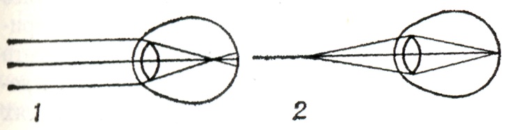 Фактически этого не бывает, т. к. происходит включение аккомодации и лучи сильнее преломляются и сводятся на сетчатку. Самая близкая к глазу точка, лучи из к-рой еще могут сходиться в фокусе на сетчатке и к-рая может быть ясно видимой при мак¬симальном напряжении аккомодации, носит название ближайшей точки ясного зрения (см.). Расстояние между дальнейшей и ближайшей точками ясного зрения является тем расстоянием, в пределах к-рого близорукий глаз может хорошо видеть. В большинстве случаев это расстояние не¬велико и зависит гл. обр. от степени Б. (чем Б. выше, тем это расстояние короче), а также от силы аккомодации. Последний фактор, однако, практически почти не играет роли при Б. в 3,0—4,0 дптр, поскольку дальнейшая точка ясного зрения таких глаз лежит на расстоянии 33—25 см перед глазом, т. е. находится от глаза на обычном, среднем, наиболее удобном рабочем расстоянии, и для глаза нет необходимости усиливать в этом случае свою рефракцию путем включения аккомодации. Для того чтобы близорукий глаз мог ясно видеть отдаленные предметы, от к-рых идут параллельные (или близкие к ним) лучи, надо эти лучи сделать расходящимися. Это может быть достигнуто приме¬нением соответствующих рассеивающих линз. Линза, дающая степень расхождения параллельных лучей, к-рая соответствует расхождению их из дальнейшей точки ясного зрения данного глаза, и определяет степень его Б. Такая линза имеет фокусное расстояние, равное отстоянию от глаза дальнейшей точки ясного зрения. Т. о., с одной стороны, степень Б. определяется положением дальнейшей точки ясного зрения, а с другой стороны, по преломляющей силе линзы, корригирующей Б., можно судить о положении дальнейшей точки ясного зрения данного глаза. Преломляющая сила линзы (в диоптриях) показывает, насколько надо ослабить рефракцию близорукого глаза. Эти рассеивающие линзы применяются для коррекции (исправления) близорукости. Поскольку по условиям своего зрения близорукие люди обычно вынуждены держать рассматриваемый предмет близко к глазам, то глаза при этом сильно конвергируют (см. Конвергенция глаз). В связи с наличием физиол. связи между конвергенцией и аккомодацией глаза (см.) у близоруких может иногда наблюдаться особое состояние непроизвольного длительного чрезмерного напряжения аккомодации (так наз. спазм аккомодации), что еще более усиливает преломляющую способность глаза, т. е. делает его как бы еще более близоруким, чем он есть (псевдомиопия). При сильной длительной конвергенции возрастает нагрузка на внутренние прямые мышцы глаз; это обстоятельство может приводить к явлениям утомления, мышечной усталости (так паз. мышечная астенопия), сопровождаю¬щейся ощущением ломоты в глазах, болями в области глазниц, головной болью. В этом случае необходимо прервать работу, связанную с напряжением аккомодации. Явления мышечной астенопии исчезают, если один глаз закрыть, т. к. при пользо¬вании только одним глазом конвергенция исчезает. Вследствие того, что близорукие должны сильно конвергировать, но не нуждаются в аккомодации, нарушаются физиол. взаимоотношения между этими двумя функциями. Мышечный конвергенционный аппарат, не подкрепляемый необходимым импульсом со стороны аккомодации и вынужденный, кроме того, усиленно работать, истощается, бинокулярное зрение расстраивается сначала лишь временно, 