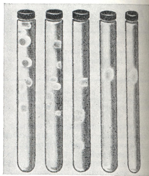При наличии в пробе ботулинического токсина погибают две мыши, к-рым вводился фильтрат без сывороток, остальные две остаются живы. Обычно картина болезни и гибели мышей очень характерна: появляется учащённое дыхание, состояние полного расслабления мышц, западение мышц брюшной стенки («осиная талия» — рис. 10), параличи и судороги перед смертью. В случае гибели всех 4 мышей следует повторить реакцию нейтрализации с экстрактами, разведёнными в 5, 10, 20, 100 раз. При разведении экстрактов посторонняя микрофлора теряет способность убивать мышей, а ботулинический токсин, обладая обычно большей биологической активностью, будет вызывать гибель мышей при разведении фильтратов. В случае обнаружения в реакции с поливалентной сывороткой ботулинического токсина сразу же ставится развёрнутая реакция нейтрализации для определения типа токсина с типоспецифическими диагностическими сыворотками. Особое внимание нужно обратить на постановку реакции нейтрализации с сывороткой крови больного, т. к. её обычно бывает мало. Следует тщательно отделить сыворотку от сгустка крови и сразу поставить развёрнутую реакцию нейтрализации с моновалентными ботулиническими сыворотками типов А, В, Е (остальные типы Б. встречаются очень редко). При получении положительной реакции нейтрализации с диагностическими ботулиническими сыворотками даётся заключение о наличии в исследуемом материале ботулинического токсина и указывается его тип. Нередко постановку реакции нейтрализации как с поливалентной, так и с моновалентными сыворотками приходится повторять из-за неспецифической токсичности посторонней микрофлоры, к-рая обычно имеется в рвотных массах, кале, поэтому в лучшем случае ответ о наличии токсина в пробе может быть дан на 2—3-й день, а о его типовой принадлежности — на 3—5-й день от начала исследования. В случае невозможности обнаружения токсина в исследуемых материалах проводятся исследования по обнаружению возбудителя Б. С этой целью производится посев 3—5 мл подготовленного материала на жидкие питательные среды. Для первичных посевов лучше использовать казеиново-грибную или казеиново-кислотную среду, бульон Хоттингера или среду типа Тароцци. Необходимо, чтобы рН был в пределах 7,2—7,4. Обязательным является также наличие в мясных средах мясного или печеночного фарша, а в казеиновых — отварною пшена и ваты. Пробирка или флакон должны быть заполнены питательной средой не менее чем наполовину. Перед посевом в среды добавляют 0,5% глюкозы. Посевы должны производиться в среды в больших пробирках или во флаконах ёмкостью по 100 - 200 мл. Сверху среда заливается слоем вазелинового масла толщиной в 0,5 см. Следует особенно помнить о том, что лучше засевать исходный посевной материал в большой объем среды (70—150 мл), чтобы культуральной жидкости первичного посева хватило на все исследования, Последующие пересевы исследуемых проб из первичного посева в теже жидкие питательные среды могут не дать токсинообразования в среде, Посев следует производить в четыре флакона, два из к-рых прогревают при t° 80° 20 мин. Два других флакона после посева не прогревают. Все флаконы помещают в термостат при t° 28 и 35° (в каждый термостат один прогретый, один непрогретый). Если в исследуемом материале возбудители Б. находятся преимущественно в вегетативной форме, то рост в пос