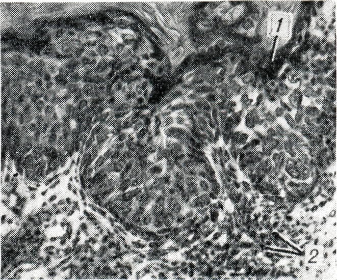 Переход в инвазивный рак происходит поданным одних авторов в 80% случаев, по данным других — более чем в 1/3 случаев. Макроскопически опухоль чаще представлена бляшкой (реже несколькими бляшками), чётко отграниченной от окружающих тканей. Бляшка бледно-розового или темно-красного цвета, с приподнятыми краями, гладкая или шероховатая, под сероватой шелушащейся коркой. Могут возникать папилломатозные разрастания (иногда с изъязвлением и пигментацией), чаще одиночные, способные сливаться в серпигинозный очаг неправильной формы (цветн. рис. 3). Микроскопически отмечается слабо выраженный акантпоз (см.) на значительном протяжении. Базальный слой отчетлив. Граница между эпидермисом и дермой не нарушена. Зернистый слой обычно слабо выражен или отсутствует. Клетки шиповатого слоя располагаются рыхло, беспорядочно, со значительным полиморфизмом (рис.). Встречаются мелкие клетки с интенсивно окрашенной цитоплазмой и ядрами и крупные клетки со светлой вакуолизированной цитоплазмой и слабо окрашенными ядрами. Ядра иногда дольчатые в виде пикнотичных комков или нескольких глыбок. Бывают крупные многоядерные клетки со светлыми или интенсивно окрашенными ядрами. Встречаются фигуры митозов, иногда неправильных. Иногда отмечается гиперкератоз с паракератозом, встречаются очажки неполного ороговения (очаговый дискератоз). Иногда кератинизации подвергаются единичные шиповатые клетки, что приводит к образованию так наз. круглых телец с интенсивно окрашенной гомогенной цитоплазмой и гиперхромным пикнотичным ядром. В дерме — густая инфильтрация из лимфоидно-гистиоцитарных и плазматических клеток, очажки дезорганизации коллагеновых волокон с превращением их в базофильные бесструктурные массы. Эластические волокна в зоне поражения выявляются обычно в виде мелких скрученных обрывков. В поверхностных отделах эпидермиса, близких к роговому слою, определяется небольшое количество гликогена. При переходе Б. б. в инвазивный рак отмечается глубокое погружение в дерму акантотических тяжей с нарушением базальной мембраны, резко выраженный полиморфизм клеток и отсутствие четких признаков ороговения (малодифференцированный рак).