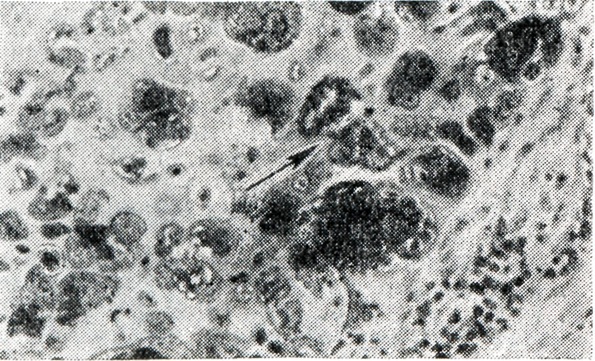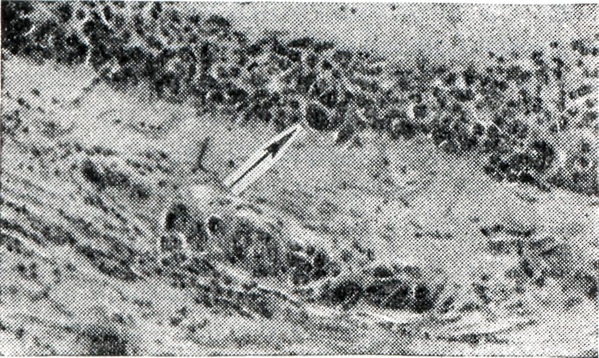 Бранхиогенный рак локализуется на боковой поверхности шеи под углом нижней челюсти у медиального края грудино-ключично-сосцевидной мышцы. Опухоль плотной консистенции, безболезненная, малоподвижная, относительно медленно увеличивается и может достигать значительных размеров, быстро срастается с окружающими тканями. Наблюдается обычно у лиц пожилого возраста. Гистологически бранхиогенные раки чаще имеют структуру плоскоклеточного рака. Для правильной постановки диагноза бранхиогенного рака имеют значение: 1) анамнестические данные о длительном существовании или оперативном удалении кисты в зоне развития опухоли; 2) гистологическое исследование опухоли (биопсии), в к-рой выявляется развитие рака в стенке кисты (рис. 1 и 2); цитологическое исследование пунктатов; 3) тщательное обследование, направленное на выявление бессимптомно протекающей первичной опухоли (носоглотки, гортани, слизистых оболочек полости рта, корня языка, щитовидной железы и др.); 4) наблюдение за больным после проведенного лечения и отсутствие у него в течение 3—5 лет злокачественной опухоли (в различных органах), метастаз к-рой мог быть первоначально оценен как бранхиогенный рак.