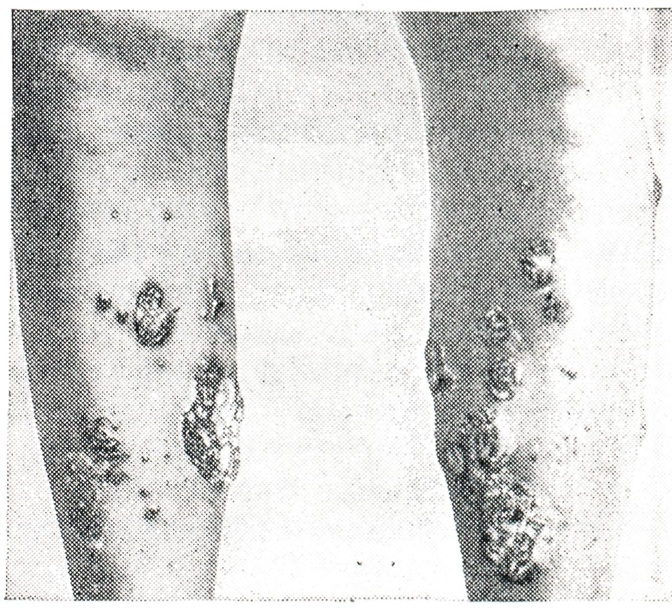 Наиболее частой и типичной формой Б. является угревидно-пустулезная (син.: acne bromica, бромные угри, рис. 1). Проявляется в виде фолликулярных пустул красновато-синюшного цвета с наклонностью к группировке, слиянию и нагноению, в результате чего возникают обширные гирляндоподобные очаги, покрытые гнойными корками. В дальнейшем они превращаются в язвенные эктимо- и рупиоподобные очаги, подживающие в центре и растущие по периферии.