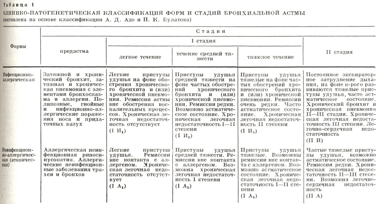 Первые попытки классификации Б. а. в зависимости от этиологических факторов были сделаны Солтером (Н. Salter) в 1860 г. Выделялись 5 типов астмы — от «вдыхания частиц», воспаления воздухоносных путей, нарушения состояния крови, нервных рефлексов и раздражения ц. н. с. В последующие годы с эволюцией учения о Б. а. предлагалось очень много классификаций, в большинстве к-рых выделялась «идиопатическая» астма и астма от воспаления воздухоносных путей. В связи с аллергической теорией генеза Б. а. и введением в практику методов специфической диагностики делались неоднократные попытки классифицировать заболевание в зависимости от результатов аллергологического обследования. Наибольшее распространение за рубежом получила классификация Раккеманна (F. Rackemann, 1918), выделившего две формы Б.а. — экзогенную и эндогенную. К первой относятся случаи, вызванные неинфекционными экзогенными аллергенами, вторая связана в основном с хрон. воспалением бронхолегочного аппарата или внелегочными очагами хрон. инфекции. В Советском Союзе вопрос классификации Б. а. обсуждается с 1963 г. В наст, время принята и вводится в практику классификация основных этиологических форм и стадий болезни, предложенная А. Д. А до и П. К. Булатовым (табл. 1). Согласно классификации различают две основные формы Б. а.— инфекционно-аллергическую и неинфекционно-аллергическую (атопическую). Первая связана с сенсибилизацией бактериальными аллергенами, к-рые поступают из очагов хрон. инфекции, локализованных преимущественно в респираторном аппарате. Вторая форма относится к группе наследственно обусловленных аллергических заболеваний (см. Атопия) и вызывается неинфекционными аллергенами.