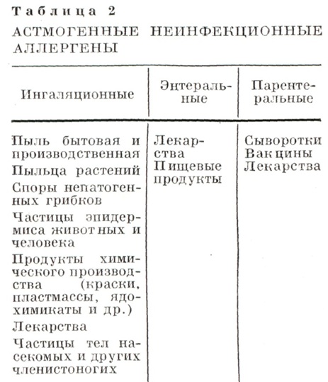 Б. а.— одно из наиболее распространённых заболеваний. По данным ВОЗ, опубликованным в 1966— 1968 гг., уровень заболеваемости Б. а. превышает заболеваемость злокачественными опухолями в США в 7 раз, в Англии — в 3 раза, туберкулезом органов дыхания в США — почти в 120 раз, в Англии — более чем в 25 раз. Заболеваемость Б. а. на 1000 населения составляет: в США — 23,4, Дании — 6,9, Мексике — 17,2, ФРГ — 5,5, Англии — 8,5, Франции — 5,0, Швеции — 7,1. В Советском Союзе заболеваемость Б. а. различна в разных климатических поясах и в районах с различным уровнем развития промышленности. Выборочные исследования заболеваемости (на 1000 населения), проведенные А. Д. А до и А. В. Боговой (1968), М. М. Омеровым (1967), Бюро санитарной статистики МЗ РСФСР (Л. А. Брушлинская, 1961; отчеты леч. учреждений ряда городов, 1958), выявили наиболее низкую заболеваемость в пустынных районах Средней Азии (0,5— 1,1), в Сибири и на Урале (1,1 —1,3); в Москве она составила 2,2; наиболее высокой оказалась в Вильнюсе (5,2), Риге (4,6) и Гомеле (4,7). В последние годы отмечается чёткая тенденция к росту заболеваемости Б. а. Так, в Москве за последние 40 лет она увеличилась в 5 раз, в Риге за 5 лет — в l½ раза. Суммарная заболеваемость мужчин и женщин примерно одинакова, но по возрастным группам есть нек-рые различия: в первые 10 лет жизни чаще болеют мальчики, с 10 до 60 лет — несколько чаще женщины, с 60 лет — мужчины. Наиболее распространена инфекционно-аллергическая форма Б. а.; атопическая форма (по наблюдениям ряда авторов) составляет ок. 20% всех случаев заболеваний. В нек-рых странах очень велика смертность от Б. а. (осложнённой и неосложнённой). По статистике ВОЗ, на первом месте в этом отношении находится ФРГ — 11,6 и Япония — 9,2 на 100 000 населения. Этиологическими факторами, вызывающими Б. а., считают экзогенные аллергены (см.). Каузальная связь с эндоаллергенами предполагается, но до наст, времени не доказана. Относительно «хорошо изучена этиология неинфекционно-аллергической (атопической) формы заболевания. Соответственно путям поступления в организм неинфекционные астмогенные аллергены делят на три группы (табл. 2).
