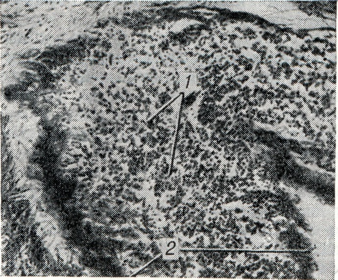 Повышение реактивной чувствительности тканей в острой и последующих стадиях и при обострениях процесса сопровождается усилением нарушения метаболизма, гистохимическими и ферментативными сдвигами; вакуольной, белковой, жировой и углеводной дистрофией эндотелия синусов, капилляров, ретикулярных элементов, нервных клеток и клеток паренхимы внутренних органов; дезорганизацией волокнистых структур, накоплением в тканях ШИК-положительных веществ. Эти процессы развёртываются в органах на фоне системного воспалительно-деструктивного поражения сосудов, сопровождающегося повышением их проницаемости, отёком тканей и другие. Острая стадия. На секции — картина острого сепсиса с гиперплазией селезёнки, увеличением лимф, узлов, печени, мелкими кровоизлияниями. Иногда наблюдается острый бородавчато-язвенный эндокардит. В кроветворных органах, печени — гиперплазия клеток ретикулоэндотелиальной системы; могут образоваться узелки по типу тифозных. В цитоплазме ретикулярных и плазматических клеток — положительная реакция на ДНК, РНК и фосфатазу. В паренхиматозных органах — дистрофические изменения, встречаются милиарные некрозы. Подострая стадия характеризуется многообразием морфологических проявлений, наклонностью к преимущественному поражению отдельных органов и систем, наличием в них бруцеллезных гранулём. Хроническая стадия характеризуется полиморфизмом очаговых поражений с признаками обострения и затухания. В органах выявляются процессы организации очагов деструкции, фиброзное превращение лимфогистиоцитарных инфильтратов и гранулём, развиваются очаговые или диффузные фибросклеротические изменения, атрофия паренхимы. В этой стадии, как и в предыдущей, возможно обострение Б. с бактериемией, генерализацией процесса и образованием метастазов в отдельных органах. Однако чаще наблюдаются чётко выраженные поражения отдельных органов и систем, определяющие клинико-анатомический профиль хронической Б. В мозговых оболочках, головном и спинном мозге, в нервных ганглиях и периферических нервах развиваются воспалительные и дистрофические изменения, составляющие морфологическую основу бруцеллезного менингоэнцефалита, менингоэнцефаломиелита, полиневрита и др. Нервные клетки, элементы макро- и микроглии, нервные волокна подвергаются дистрофическим изменениям и распаду. При этом отмечается также системный продуктивный тромбоваскулит, циркуляторные и деструктивные изменения в различных отделах нервной системы. В оболочках, веществе головного и спинного мозга, ганглиях и периневрии образуются бруцеллезные гранулёмы, из вещества мозга и цереброспинальной жидкости можно выделить бруцеллы. В сердце может развиться эндокардит и миокардит с образованием бруцеллезных гранулём в миокарде и стенках артерий (рисунок 2). При эндокардите из наложений на клапанах удаётся выделить культуру бруцелл. Чаще встречается бородавчато-язвенный эндокардит аортального (рисунок 3), реже митрального клапанов. В этих случаях Б. приобретает черты sepsis lenta. Поражение сердца и сосудов при Б. иногда развивается на фоне предшествующих заболеваний другой этиологии. Поражение лимф, узлов является постоянным и закономерным для всех стадий Б. Иногда наблюдается увеличение лимф, узлов в виде бубонообразных пакетов, с очагами некроза. Под