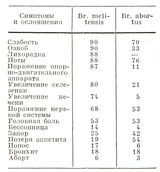 Типичны для хронической Б. функциональные расстройства нервной системы типа неврастении с жалобами на слабость, утомляемость, повышенную раздражительность, нарушения памяти, бессонницу. Они встречаются у большинства больных и иногда являются ведущими в клинической картине. Органические поражения центральной нервной системы в виде энцефалитов, энцефаломиелитов, арахноидитов встречаются реже (5,8%), но из-за своей тяжести и частых остаточных явлений имеют большое значение в формировании последствий. Изменения со стороны периферических нервов носят характер невралгий, плексалгий (30,1 % больных) или же выраженных невритов, радикулитов (12,6%). Особенно упорно протекают вторичные радикулиты, обусловленные поражениями позвоночника. Невриты зрительного и слухового нервов могут приводить к стойкому снижению зрения и слуха. Очень часты поражения опорно-двигательного аппарата. Патогенез их может быть различным. Преобладают артралгии без видимых анатомических изменений и нарушения функции суставов. Реже встречаются органические поражения суставов, позвоночника. Сравнительно тяжело протекают метастатические поражения: спондилиты, спондилоартриты, остеоартриты, пери- и параартриты. Гнойные поражения костей с образованием свищей и натечников редки и более характерны для заболеваний, вызываемых Br. suis. Как правило, процессы разрастания костной ткани преобладают над деструкцией. Часты бурситы метастатического происхождения, особенно локтевых и коленных суставов, воспалительные изменения в грудино-ключичном и крестцово-подвздошном сочленениях. Инфекционно-аллергические артриты (14,6% больных) клинически весьма сходны с ревматическими изменениями суставов и характеризуются значительными объективными изменениями, летучестью, относительно быстрым восстановлением функции (смотри Артриты). Заметно участились случаи системно прогрессирующих поражений суставов типа ревматоидного артрита. Для хронической Б. типично увеличение печени без значительных нарушений её функции, тогда как селезёнка бывает увеличенной только при очень выраженной активности инфекции. Поражения остальных внутренних органов относительно редки. Могут встречаться бронхиты и бронхопневмонии, миокардиты, изменения со стороны желудочно-кишечного тракта (понижение кислотности желудочного сока, холециститы), орхиты у мужчин, аднекситы и аборты у женщин. В моче иногда отмечается альбуминурия и незначительная гематурия без нарушения выделительной функции почек. Описаны редкие проявления Б.: циррозы печени, спленомегалия с кровотечениями из вен пищевода, эндокардиты, протекающие с типичной клиникой затяжного септического эндокардита, тромбофлебиты, тромбоз артерий, поражения надпочечников, щитовидной железы, гипофиза, маститы. Длительность хронической Б. не превышает трёх лет. Более длительное активное течение встречается как исключение у отдельных больных, а также может быть результатом реинфекции и суперинфекции у лиц, профессионально связанных с возможностью заражения. У части больных (3%) имеются стойкие остаточные явления: чаще всего наблюдаются изменения со стороны опорно-двигательного аппарата — контрактуры, анкилозы, артрозы, спондилезы. Отмечаются гормональные нарушения у лиц обоего пола. Такие явления встречаются или при сохранившейся е