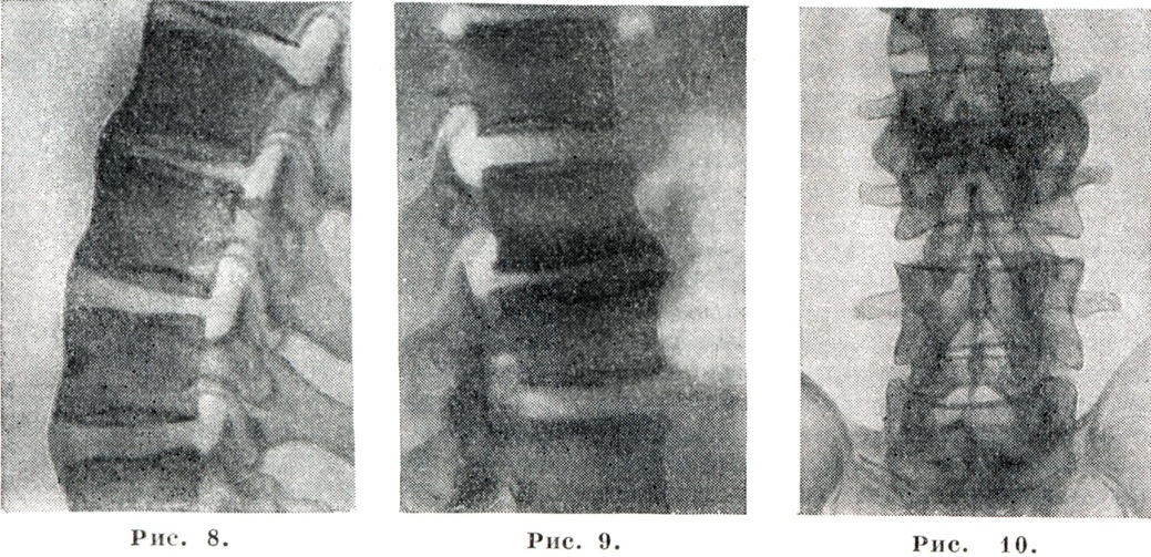 В начальном периоде подобные суставные поражения рентгенологически проявляются аналогично любому инфекционному артриту, но в последующем течении обладают некоторыми характерными чертами. И тенденция к анкилозированию суставных концов как по темпам развития, так и по «совершенству» наступающих спаяний гораздо меньше, чем при других кокковых поражениях суставов. С. А. Рейнберг утверждает, что при бруцеллезных остеоартритах в начальных фазах развиваются обычно лишь небольшие изменения суставных поверхностей типа мелких узур, и вскоре параллельно вокруг узур возникает склеротическая реакция. Принадлежащем лечении исход процесса в анкилозирование может отсутствовать, и появляется картина артрозоартрита (рисунок 7), при котором наряду с наличием мелких узур и сужения рентгеновской суставной щели развиваются костные пролифераты, то есть деформирующий (вторичный) артроз. При такого рода поражениях рентгенологические признаки нарастают, как при гнойном артрите, однако обычно в более замедленном темпе. Продуктивные (склеротические) реакции наступают поздно, а анкилозирование, в отличие от обычных кокковых артритов,— замедленно. «Идеального» костного анкилозирования при бруцеллезном остеоартрите даже в результате обширных деструкции не наступает, и ретроспективный дифференциальный диагноз с другими кокковыми артритами не труден. В отличие от туберкулёзного артрита, темпы нарастания деструктивных изменений заметно ускорены, а появление сопутствующих периоститов вблизи суставных концов говорит против туберкулёза. Поражения позвоночника при Б. разнообразны (рисунок 8—10) и довольно хорошо изучены. Здесь наблюдаются: лигаментиты, межпозвоночные остеохондриты, спондилиты. Различия между бруцеллезными остеохондритами с преимущественным поражением зоны межпозвоночных дисков и спондилитами аналогичного генеза лишь количественные: при межпозвоночных остеохондритах рентгенологическая картина указывает на значительно большее разрушение межпозвоночного диска (иногда двух соседних) и меньшее участие тел позвонков (умеренно поражаются лишь прилежащие к диску поверхности соседних позвонков). При спондилите деструктивные изменения проявляются преимущественно в теле одного (реже двух и более) позвонка. Для бруцеллезного межпозвоночного остеохондрита характерны все признаки аналогичных поражений при других инфекциях (посттифозных, постгриппозных). Некоторые отличия заключаются в большем вовлечении связочного аппарата (более массивные «скобки» между соседними телами позвонков), замедленных темпах сужения межпозвоночной щели, раннем наступлении субхондрального склероза. Диагноз туберкулёзного поражения может быть отвергнут на основании тех же признаков: раннее появление склероза, краевых «скобок», быстрые темпы нарастания сужения межпозвоночной щели. Бруцеллезный спондилит по рентгенологической семиотике располагается как бы на границе между остеомиелитом позвонка и туберкулёзным спондилитом, что относится не только к рентгенологической картине, но и к клиническим признакам. Клинико-рентгенологически бруцеллезный спондилит протекает более бурно, чем туберкулёзный спондилит, хотя может дать схожую картину клиновидной деструкции тела (тел) позвонков. Даже рентгенологическое выявление тени натёчн