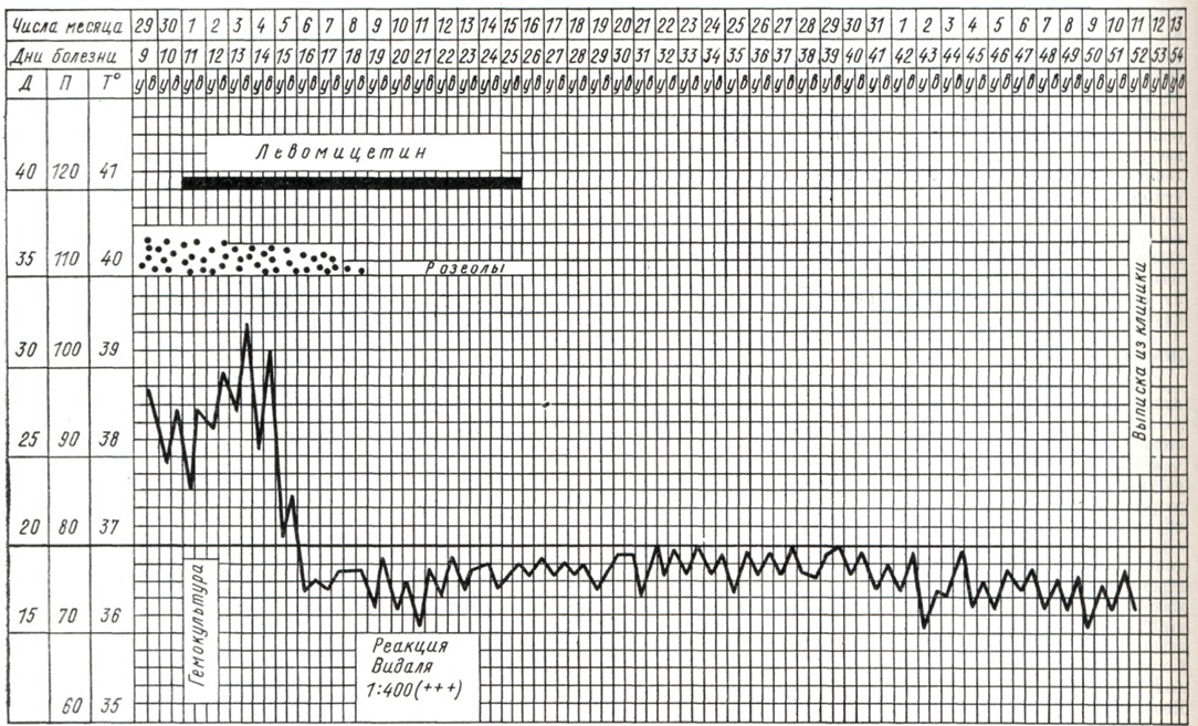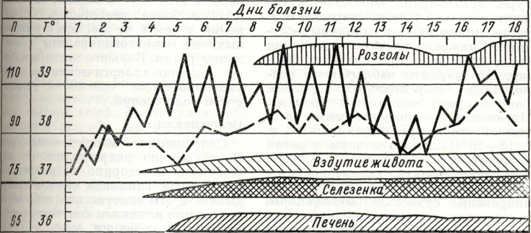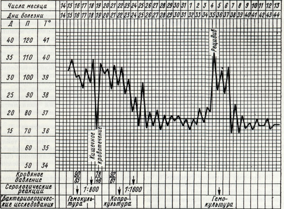 Гемограмма после 4—5-го дня от начала болезни становится характерной: количество лейкоцитов в 1 микролитров крови снижается до 4500— 2500, в лейкоцитарной формуле отмечается нейтропения со сдвигом лейкоцитарного ряда влево, анэозинофилия, относительный лимфоцитоз; РОЭ ускорена. После 6—8-го дня от начала болезни клиническая картина приобретает полную очерченность; в последующие дни лихорадочного периода болезни степень интоксикации организма, нарушения со стороны отдельных органов и систем, описанные выше, продолжают нарастать. На этом фоне могут возникнуть обострения Брюшной тиф. В случаях благоприятного течения болезни после продолжительного срока повышенной температуры при естественном течении Брюшной тиф температурная кривая приобретает амфиболический характер (с колебаниями в 2—2,5° между утренней и вечерней температурой), интоксикация ослабевает, становятся менее выраженными многие важные симптомы болезни: начинается период выздоровления. К особенностям течения неосложненного Брюшной тиф (циклическая форма средней тяжести) следует отнести те случаи болезни, которые сопровождаются развитием рецидивов и бактерионосительства. В пожилом и старческом возрасте болезнь протекает при отсутствии ряда симптомов, свойственных заболеваниям у молодых: температурная кривая носит неопределённый характер, розеолезная сыпь часто отсутствует, гепатолиенальный синдром выражен незначительно, вместо лейкопении может наблюдаться нормальное или слегка повышенное количество лейкоцитов в 1 микролитров. Эти особенности клинического течения болезни значительно затрудняют диагностику; при развитии осложнений у пожилых больных Брюшной тиф (особенно в случаях перфорации язвы в стенке тонкой кишки с развитием перитонита) также возникают большие диагностические затруднения. Из вариантов клинического течения Брюшной тиф следует прежде всего назвать абортивную форму, при которой вслед за коротким достаточно выраженным периодом развития клинических симптомов возникает резкий перелом и больной начинает поправляться. При атипично протекающих лёгких и легчайших формах болезни (старое название «амбулаторный брюшной тиф») интоксикация выражена слабо, самочувствие и физ. силы сохраняются в такой мере, что заболевший может продолжать работать, ходит, посещает поликлинику и тому подобное. У таких больных интоксикация организма выражена незначительно, температура бывает не выше 38°, лихорадочный период короткий, увеличение печени и селезёнки отсутствует или выражено слабо, сыпь на коже появляется редко. Тяжёлые формы Брюшной тиф — гиперпиректическая и геморрагическая — встречаются не чаще чем в 0,5% случаев. Последняя из названных форм характеризуется развитием множественных геморрагических элементов (петехий, экхимозов) на коже и слизистых оболочках в сочетании с обычными розеолезными элементами; у таких больных могут быть носовые, кишечные, маточные кровотечения, макрогематурия. В отдельных, редко встречающихся случаях наблюдается так наз. колитиф, который характеризуется высокой лихорадочной реакцией, спонтанными болями в правой подвздошной области и локальными болями при пальпации живота соответственно положению слепой кишки, метеоризмом, жидким или полужидким стулом с примесью слизи. При заболеваниях Брюшной ти