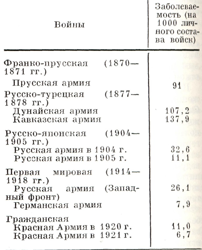 Особенности эпидемиологии и профилактики брюшного тифа в войсках брюшной тиф в прошлом представлял большую эпидемиологическом опасность для войск не только в военное, но и в мирное время. Недаром его относили к так называемый военным, или солдатским, инфекциям. На заболеваемость брюшной тиф в войсках различных армий (таблица) всегда оказывал влияние общий уровень санитарный состояния войск, который резко ухудшался в периоды войн. Таблица. Заболеваемость брюшным тифом в войсках во время войн