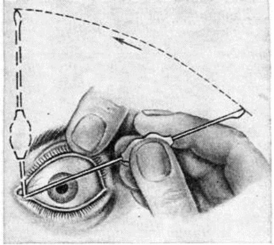 При Дакриоцистит новорожденных проводят массаж области слёзного мешка в направлении сверху вниз. Если это не приводит к разрыву мембраны, производят промывание слёзного мешка под давлением; при безуспешности промывания — зондирование слёзных путей (рисунок 2). При отсутствии эффекта показана дакриоцисториностомия. При флегмонозном дакриоцистите — антибиотики парентерально и промывание слезоотводящих путей растворами антибиотиков.