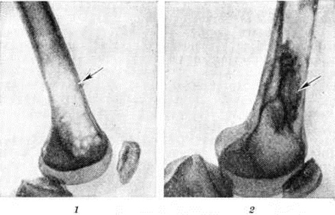 Развитию Декомпрессионная болезнь способствуют тяжёлая физических нагрузка, переохлаждение (смотри полный свод знаний Охлаждение организма), гиперкапния (смотри полный свод знаний), гипероксия (смотри полный свод знаний), нарушения установленного режима и отдыха. Для экспериментального воспроизведения Декомпрессионная болезнь обычно используют рекомпрессионные камеры и барокамеры (смотри полный свод знаний Барокамера), позволяющие создавать газовые среды определённого состава и давления применительно к кессонной (смотри полный свод знаний Кессонные работы), водолазной (смотри полный свод знаний Водолазные работы) и авиакосмической практике (смотри полный свод знаний Полёты, высотные). Аэроэмболию можно моделировать введением инертных газов в венозную систему животных. Патологическая анатомияНаиболее выраженными и специфическими морфологически изменениями при быстрой смерти от тяжёлой Декомпрессионная болезнь являются наличие многочисленных газовых пузырьков в венозной системе, переполненная и растянутая пузырьками газа правая половина сердца, явления отёка и эмфиземы лёгких, множественные очаги кровоизлияний в различных органах и тканях. Иногда в лёгочной артерии обнаруживается пенистая кровь. Трупы погибших от Декомпрессионная болезнь подвергаются быстрому и резкому окоченению. Кожные покровы и слизистые оболочки цианотичны. Клиническая картинаТечение, симптоматика и тяжесть заболевания определяются величиной, количеством и локализацией газовых пузырьков в организме, наличием провоцирующих факторов и своевременностью лечения. По тяжести течения условно различают три формы Декомпрессионная болезнь: лёгкую, среднюю и тяжёлую. Для лёгкой формы характерны кожный зуд и сыпь, нерезкие боли в мышцах, костях, суставах и по ходу нервных стволов. При Декомпрессионная болезнь средней тяжести происходит резкое ухудшение общего состояния, появляется холодный пот, отмечаются сильные боли в мышцах, костях и суставах, сопровождающиеся иногда вздутием, тошнотой, рвотой, а также кратковременная потеря зрения. При тяжёлой форме у больных развиваются симптомы поражения центральная нервная система (парезы и параличи конечностей), сердечно-сосудистой и дыхательной систем. Отмечаются загрудинные боли, удушье, цианоз, коллапс (смотри полный свод знаний). Некоторые авторы выделяют также смертельную и хронический формы Декомпрессионная болезнь (М. И. Якобсон, 1950; Майлс, 1971). При смертельной форме имеет место массивная аэроэмболия, приводящая к блокированию кровообращения и поражениям лёгких, сердца, мозга, несовместимым с жизнью. Для хронической формы характерны поздние последствия аэроэмболии и аэротромбоза в виде асептического некроза костей (рисунок 4), деформирующего остеоартроза и другие При возвращении от повышенного давления к нормальному симптомы заболевания в большинстве случаев развиваются в течение первого часа после декомпрессии. Иногда они отмечаются уже в процессе ступенчатой декомпрессии и, как исключение, через 6—12 часов после декомпрессии. Важно помнить, что и относительно лёгкие симптомы в начале заболевания могут быстро перерасти в тяжёлые с резким ухудшением сердечной деятельности, отёком лёгких (смотри полный свод знаний) и параличом дыхательного центра.