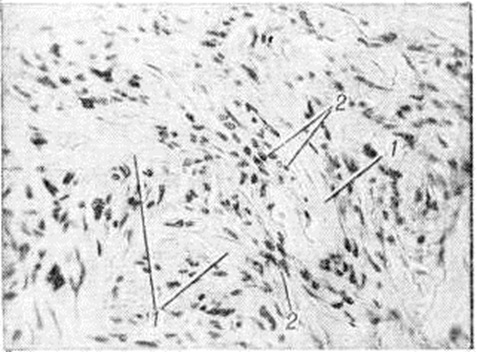 Микроскопически опухоль состоит из переплетающихся коллагеновых волокон (рисунок), обычно расположенных в виде так называемый муаровых структур. Между волокнами обнаруживаются веретенообразные клетки типа фибробластов, иногда с наличием гистиоцитарных элементов или пенистых клеток, содержащих двоякопреломляющие липиды. Встречаются сосуды капиллярного типа. Эластические волокна в опухоли, как правило, отсутствуют, нередко отмечается гиалиноз, иногда резко выраженный. Дерматофиброма нечётко отграничена от дермы, эпидермис над ней часто с признаками акантоза (смотри полный свод знаний) и гиперкератоза (смотри полный свод знаний).