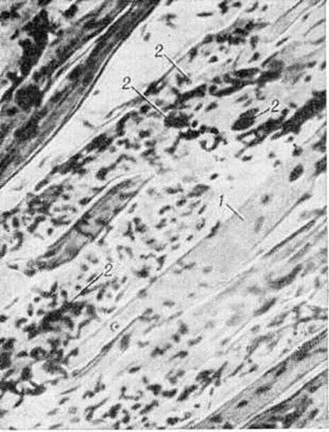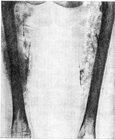Во всех случаях Дерматомиозит, особенно у лиц старшего возраста, необходимо проводить тщательное общеклинический обследование для исключения опухоли. Рентгенологические данные при Дерматомиозит не являются специфическими, однако они могут способствовать уточнению степени поражения мягких тканей и внутренних органов. Рентгенограммы следует производить с помощью так называемый мягкого излучения, чтобы получить структуру мягких тканей. В острой стадии заболевания на таких рентгенограммах мышцы выглядят более прозрачными, отмечаются просветления. Подкожная клетчатка очень прозрачна, иногда в ней видны даже мелкие вены. При хронический Дерматомиозит типичным является наличие кальцификатов в мягких тканях (рисунок 2). В подкожной клетчатке чаще всего обнаруживаются неправильной формы кальцификаты, а на границе мышц и подкожной клетчатки иногда отмечается ленточный тип кальцификации. В области тазобедренного сустава часто имеется обширная кальцификация — так называемый псевдотуморозные изменения. В лёгких выявляется картина интерстициального фиброза преимущественно базальных отделов. Иногда отмечаются кальцификаты в плевре. Сердце часто увеличено в размерах. Дифференциальный диагноз при остром и подостром Дерматомиозит следует проводить с инфекционными и неврологический заболеваниями, системной склеродермией (смотри полный свод знаний), системной красной волчанкой (смотри полный свод знаний). При остром начале Дерматомиозит, когда имеются лихорадка, ознобы, ускоренная РОЭ, нарастающая мышечная слабость позволяет исключить инфекционные заболевания (сепсис, тифы, рожа и другие). Быстрое развитие болезни, обездвиженность, нарушение глотания имитируют тяжёлый полиневрит (смотри полный свод знаний). Уточнение генеза и характера наблюдающихся поражений позволяет дифференцировать ложно-неврологическую симптоматику от истинной. Склеродермия, как правило, не имеет острого начала. Ведущим симптомом при ней является плотный отёк кожи без явлений дерматита. В отличие от системной красной волчанки, при Дерматомиозит не столь выражена висцеральная патология, в картине болезни преобладает поражение мышц, иной характер кожных изменений, в крови отсутствуют волчаночные клетки. Хронический Дерматомиозит без кожного синдрома (собственно полимиозит) следует дифференцировать с различными миопатиями: прогрессирующей мышечной дистрофией, тиреотоксической миопатией и другие (смотри полный свод знаний Миопатия). Решающее значение часто имеет биопсия мышцы. ЛечениеПри остром, подостром и обострении хронический Дерматомиозит назначают кортикостероиды, исключая триамсинолон, который противопоказан при Дерматомиозит, так как может вызвать миопатию. Предпочтительно применение преднизолона в адекватных, как правило больших, дозах: при остром течении 80—100 мг, при подостром 60 миллиграмм, при обострении хронический Дерматомиозит 30—40 миллиграмм в день. Эти дозы при условии переносимости и отсутствии противопоказаний назначают в течение 2— 3 месяцев и более до отчётливого терапевтического эффекта. В последующие месяцы производят очень медленное снижение дозы преднизолона до поддерживающей: при остром и подостром Дерматомиозит в течение первого года заболевания она должна быть 30— 40 миллиграмм; на втором и третьем 