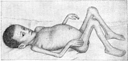 Диффузная слабость скелетных мышц с болями и отёком ограничивает двигательные возможности ребёнка и нередко приводит почти к полной обездвиженности. У детей значительно чаще, чем у взрослых, развиваются сухожильно-мышечные контрактуры (рисунок 3) и кальциноз. В то время как у взрослых развитие кальциноза мышц означает окончание активной фазы заболевания, у детей распространённый кальциноз может наблюдаться в сочетании с активным Дерматомиозит. Иногда кальцинаты частично выступают над поверхностью кожи (цветной рисунок 5). Поражение дыхательных и глоточных мышц проявляется дисфагией (смотри полный свод знаний), дизартрией (смотри полный свод знаний), снижением экскурсии грудной клетки. Прогрессирующее поражение дыхательных мышц может привести к остановке дыхания. У половины больных отмечается артралгия. Могут наблюдаться артриты, иногда с последующей деформацией суставов. Поражение лёгких при Дерматомиозит выражается чаще всего сосудисто-интерстициальной пневмонией, характеризующейся прогрессированием процесса, формированием лёгочного фиброза, появлением признаков лёгочного сердца и бронхопневмонией. Возможно наслоение вторичной инфекции, туберкулёза лёгких. Плеврит может быть как сухим, так и экссудативным, чаще без значительного выпота, с развитием адгезивных процессов. Поражение сердца чаще проявляется диффузным или очаговым миокардитом (смотри полный свод знаний), миокардиодистрофией и реже эндомиокардитом, миоперикардитом или панкардитом (смотри полный свод знаний). Иногда наблюдаются птоз (цветной рисунок 1), экзофтальм. В активной фазе заболевания в той или иной степени поражаются сосуды глазного дна. Явления гастроэнтероколита (смотри полный свод знаний) отмечаются у половины больных детей, иногда с кровотечениями, язвенными процессами вплоть до перфорации. Абдоминальный синдром (смотри полный свод знаний Псевдоабдоминальный синдром) обычно сопровождает тяжёлую клинической картину и является следствием распространённого васкулита и дистрофических изменений (лечение кортикостероидами усиливает трофические нарушения). Генерализованное поражение мышц нередко симулирует неврологический симптоматику, в то же время истинное поражение центральной и периферической нервной системы встречается с большим постоянством. В большинстве случаев Дерматомиозит сопровождается в той или иной степени выраженной гепатоспленомегалией (смотри полный свод знаний Гепато-лиенальный синдром), лимфаденопатией. Наблюдаются ускоренная РОЭ, белковые, ферментативные и иммунологический сдвиги, небольшая протеинурия с умеренными изменениями осадка мочи. Степень выраженности этих изменений совпадает с активностью процесса. ЛечениеПри выраженной активности Дерматомиозит назначают преднизолон, 1—3 миллиграмм на 1 килограмм веса ребёнка в сутки. Когда динамика поражения дыхательных и глоточных мышц бывает торпидной, необходимо применение «ударных» доз (4—6 миллиграмм на килограмм веса в сутки). При стабилизации процесса (обычно через 4—8 недель) дозу постепенно снижают (индивидуально) до поддерживающей (от 20 до 5 миллиграмм в сутки). Поддерживающую терапию больные получают длительно, иногда годами, находясь под амбулаторным наблюдением. Целесообразно применение антихолинэстеразных средств, салицилатов, пироз