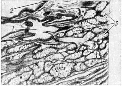 Дермоид обязательно содержит ткани, не характерные для данной области и не образующиеся в процессе метаплазии местных тканевых элементов. Дермоид обычно имеет округлую, не всегда правильную форму, гладкую или чуть бугристую поверхность. Величина его от долей сантиметра до крупных размеров. Консистенция плотноэластическая или тестоватая, неоднородная на различных участках. Дермоид бывает однокамерным и многокамерным, содержимое его — сало или желеобразные массы различной густоты, сероватого или буроватого цвета, с клубками волос. Комки сальной массы состоят из слущённых клеток плоского эпителия, кристаллов холестерина и аморфного жира; стенка кисты состоит из плотной соединительной ткани с участками обызвествления, иногда содержит хрящевую или костную ткань. Внутренняя поверхность часто имеет вид кожи и выстлана многослойным плоским эпителием (рисунок 1). Глубже расположены сальные и потовые железы, волосяные луковицы и обильная сосудистая сеть. Встречаются кисты, имеющие на внутренней поверхности возвышение — так называемый головной бугор. Он плотен, покрыт кожей и может содержать элементы всех трёх зародышевых листков. В некоторых Дермоид внутренняя поверхность на различном протяжении лишена эпителиальной выстилки, покрыта ржавого вида наложениями. Такой Дермоид называют абортивным или стареющим. Стенка его кое-где гиалинизирована, содержит лимфоцитарные инфильтраты, отложения гемосидерина, кристаллы холестерина, очаги ксантоматоза. Утрата эпителиальной выстилки, которая заменяется грануляционной тканью, значительно затрудняет диагностику. Дермоид возникает чаще в местах слияния и зарастания эмбриональных борозд и полостей, где образуются идущие вглубь складки эпидермиса. Встречается Дермоид в различных частях тела, но чаще всего в области головы, переднем средостении, и яичниках, в брюшной стенке, в толще забрюшинной и тазовой клетчатки, реже в печени, почках, головном мозге и его оболочках. При локализации на открытых частях тела Дермоид обнаруживаются в молодом возрасте. Дермоид, расположенные в клетчатке брюшной и тазовой области, в грудной полости, выявляются поздно, иногда сопровождаются болевыми ощущениями.
