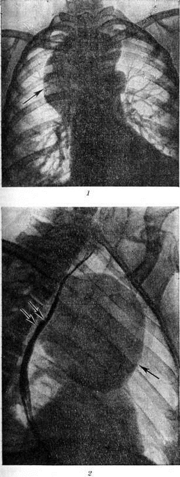 стенки крестца и отклонение копчика кзади. При расположении Дермоид в средостении наиболее полную информацию даёт пневмомедиастинография (смотри полный свод знаний) в сочетании с томографией (смотри полный свод знаний). Дермоид обычно представляется в виде однородной овоидной тени в верхнем или среднем отделе средостения (рисунок 2). Латеральные его контуры, выступающие чаще в правое лёгочное поле, обычно гладки или слегка волнисты; медиальные сливаются с тенью средостения, а при больших Дермоид они могут выступать и слева от него. Нередко отмечается обызвествление стенки Дермоид, могут обнаруживаться костные включения, зубы. В отличие от целомических и паразитарных кист конфигурация Дермоид не меняется в зависимости от дыхания и натуживания.