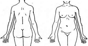 Симптоматика. Паралич, сопровождающийся развитием атрофий с реакцией перерождения, наблюдается в тех мышцах, которые иннервируются поражёнными нервами. К ним относятся мелкие мышцы кисти: мышцы возвышения большого пальца и мизинца, межкостные и червеобразные мышцы. Анестезии соответствуют общим схемам расстройства чувствительности и охватывают внутреннюю поверхность плеча, предплечья и кисти (рисунок). Вегетативно-трофические расстройства проявляются акроцианозом, гипергидрозом или сухостью кожи. На одноименной стороне иногда отмечается симптомокомплекс Бернара — Горнера: сужение зрачка, глазной щели и энофтальм (смотри полный свод знаний Бернара — Горнера синдром).