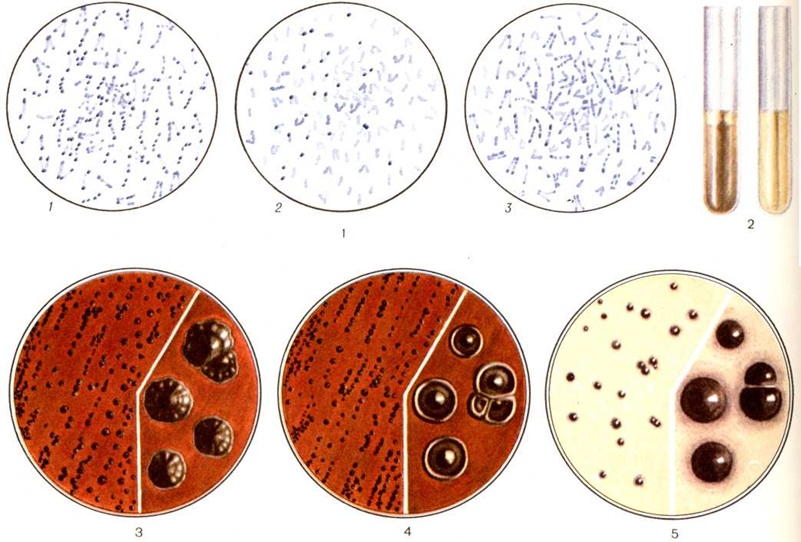 Молекула токсина состоит из двух фрагментов, один из которых стабилен, обладает только ферментативной активностью, а второй лабилен и несёт протективную функцию. Предполагают, что синтезированный внутриклеточно токсин выделяется в окружающую среду через каналы в клеточной стенке Cor. diphtheriae (В. М. Кушнарев с соавторами, 1971). Для синтеза токсина требуются те же условия, что и для роста бактерий Дифтерия, но добавочное значение имеют глюкоза, мальтоза и их метаболиты, а также ростовые факторы — никотиновая и пимелиновая кислоты. Оптимальная реакция среды для токсинообразования при pH 7,8—8,0. В опытах in vivo и in vitro перенос фага из лизогенной и токсигенной клетки Cor. diphtheriae к нетоксигенным и чувствительным к данному фагу культурам Cor. diphtheriae и из других коринебактерий приводит к приобретению последними лизогенности (смотри полный свод знаний Лизогения) и токсигенности (смотри полный свод знаний Вирулентность). Открытый в 1951 год Фрименом (V. Freeman) феномен фаговой конверсии нетоксигенных дифтерийных штаммов в токсигенные (смотри полный свод знаний Фаговая конверсия) трактуется следующим образом. Ген, детерминирующий токсигенез, инкорпорирован в хромосому одного из дифтерийных умеренных фагов (наиболее изучен β-фаг), поэтому токсигенность присуща лизогенным штаммам, несущим умеренные фаги. Вид Cor. diphtheriae неоднороден. Он подразделяется на токсигенные и нетоксигенные разновидности, а также на различные культурально-биохимический, серологические и фаготипы. Выделяют два основных культурально-биохимический типа: гравис и митис, а также ряд промежуточных форм — тип интермедиус [Андерсон (J. S., Anderson) с соавторами, 1931, 1933] и тип минимус (Фробишер, 1946). Наиболее чётко типы дифференцируются по форме колоний на среде Мак-Лауда — варианте кровяного теллуритового агара. Колонии типа гравис (цветной рисунок 3) через 48—72 часа роста имеют диаметром 1,0—2,0 миллиметров, волнистые края, отличаются радиальной исчерченностью и уплощённым центром, напоминают цветок маргаритки. Цвет их благодаря восстановлению теллура и соединению его с одновременно образующимся сероводородом (H2S) серо-чёрный, поверхность колоний матовая. На бульоне представители типа гравис растут в виде крошащейся плёнки. Ок. 90% штаммов расщепляет крахмал, декстрин и гликоген с образованием кислот. Второй биотип — митис — на поверхности кровяного теллуритового агара формирует круглые, слегка выпуклые, черные, матовые колонии, нередко окружённые валиком с ровными краями, диаметром 1,0—2,0 миллиметров (цветной рисунок 4); на бульоне растёт обычно в виде равномерной мути. Большинство штаммов не ферментирует крахмал, декстрин и гликоген. Колонии типа интермедиус круглые и выпуклые, мельче, чем у типа митис, не имеют валика, черные, с блестящей поверхностью; отношение к крахмалу и другим полисахаридам непостоянное. Все биотипы продуцируют идентичный токсин, хотя токсигенность присуща типу гравис. Обозначения типов были введены англ. авторами (Андерсон с соавторами, 1931), полагавшими, что гравис ассоциируется с более тяжёлыми, а митис — с более лёгкими формами болезни. Последующие наблюдения не смогли подтвердить чёткой связи между биотипами и формами заболевания Дифтерия, а также степенью их эпидемиологической опасности. Серологические неоднородность вида Cor., diphtheriae обусловлена типоспецифи