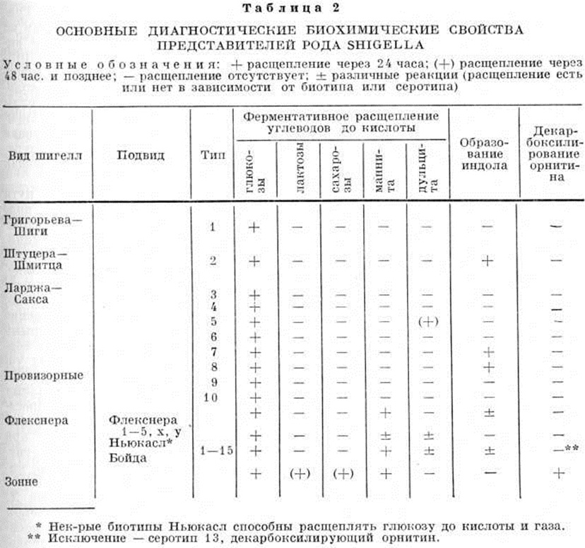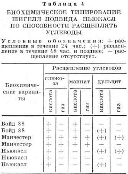 Шигеллы Ньюкасл в зависимости от характера расщепления глюкозы, маннита и дульцита подразделяются по Эдвардсу и Юингу (P. R. Edwards, W. Н. Ewing, 1962) на 7 биохимический типов (таблица 4). Для ускоренной диагностики Дизентерия применяют метод флюоресцирующих антител (смотри полный свод знаний Иммунофлюоресценция). При диагностике применяют также иммуно л. реакции, основанные на обнаружении антител к возбудителю. Специфические антитела в сыворотке крови больного при острой Дизентерия обнаруживают с 5—8-го дня болезни с последующим нарастанием их содержания к 15—20-му дню. Наиболее достоверные результаты получают при изучении парных сывороток крови больных, взятых дважды с целью выявления динамики титра антител. Для диагностики Дизентерия можно использовать чувствительную и специфическую реакцию пассивной гемагглютипации (смотри полный свод знаний) с эритроцитарными диагностикумами из шигелл Зонне и Флекснера; гемагглютинины обнаруживаются в сыворотке крови больных Дизентерия в течение 3 месяцев. Диагностическим является титр 1 : 200.