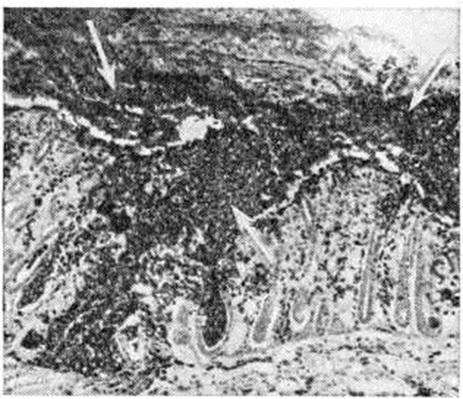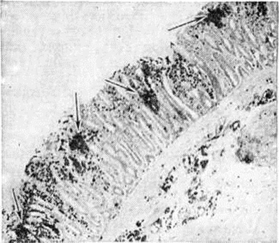 В подслизистом и межмышечном нервных сплетениях толстого кишечника обнаруживаются дегенеративные изменения нейронов; их считают причиной замедленной регенерации дизентерийных язв. В других органах при Дизентерия обнаруживаются дистрофические изменения, объясняемые как нарушением питания (особенно при длительной болезни), так и действием бактериальных продуктов и других токсических веществ, проникающих через повреждённую слизистую оболочку кишки. С появлением химиотерапевтических препаратов направленного действия смертельные исходы и тяжёлые формы колита вообще почти не встречаются. С помощью методов морфологически исследований (иммуногистохимического, электронно-микроскопического и другие) удалось получить новые данные, важные для понимания патологический анатомии и патогенеза дизентерийной инфекции. Так, в эксперименте была установлена способность шигелл к паразитированию в эпителиальных клетках кишечника (рисунок 4). При этом покровные клетки, поражённые шигеллами, обнаруживаются только в очагах гнойного воспаления и отсутствуют в участках простого катара. По мере размножения микробов эпителиальные клетки разрушаются и слущиваются. В маленьких кусочках ткани, получаемых путём биопсии при катаральных колитах у человека, очажки воспаления с шигеллами в эпителии попадаются редко. ИммунитетОсобенности дизентерийной инфекции (склонность к переходу в хронический форму, частые рецидивы) способствовали тому, что вопрос о наличии иммунитета при этой болезни долгое время оставался спорным. Клинической, и экспериментальные наблюдения П. К. Лихторович и другие (1956), Н. А. Яхнина (1958), Хонжо (S. Honjo) с сотрудники (1967) и другие свидетельствуют о возникновении постинфекционного специфического иммунитета (смотри полный свод знаний) продолжительностью от 1—3 месяцев до 1 года. До 60-х годы вопросы специфического иммунитета при Дизентерия рассматривались исключительно в связи с функцией ретикулоэндотелиальной и мезенхимальной систем организма. Был накоплен большой материал, свидетельствующий о повышении в ходе болезни содержания сывороточных антител (агглютининов, преципитинов, комплементсвязывающих антител, гемагглютининов) и превентивной активности сыворотки крови, получены данные о накоплении в сыворотке крови больных Дизентерия бактериолизинов. Однако установлено, что уровень антител не определяет степени невосприимчивости организма к последующему заражению и в ряде случаев не соответствует тяжести болезни. При Дизентерия наряду с гуморальной усиливается клеточная защитная реакция. По мнению М. В. Войно-Ясенецкого (1963) и другие, захват и переваривание шигелл в слизистой оболочке кишечника в основном осуществляют полиморфно-ядерные лейкоциты. Такеути (A. Takeuchi, 1968) и сотрудники полагают, что в этом процессе участвуют также мононуклеары — тканевые макрофаги и гистиоциты. Более конкретны стали представления о местном иммунитете при дизентерии Преобладающее большинство работ по этому вопросу проведено на кератоконъюнктивальной модели (у морской свинки). По мнению Формала (S. Formal, 1966) и сотрудники и Ю. А. Белой (1970), местный иммунитет имеет в основном клеточно-тканевой характер. Другим вероятным механизмом местного иммунитета при Дизентерия является невосприимчивость самих эпителиальных клеток. Дизентери