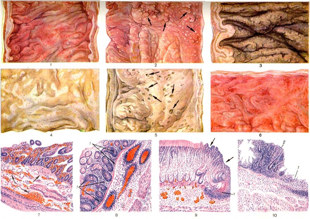 При острых дизентерийных колитах нарушения целости тканей и скопления полиморфно-ядерных лейкоцитов ограничены пределами собственно слизистой оболочки. В подслизистой основе обычно наблюдается лишь расширение кровеносных сосудов с миграцией полиморфно-ядерных лейкоцитов, а также возникает то более, то менее выраженный отёк, иногда с кровоизлияниями. При особо тяжёлых формах колитов, называемых дифтеритическими (цветной рисунок 3), на обширных участках слизистая оболочка почти полностью отсутствует, подслизистая основа очень сильно утолщена и пронизана густой сетью волокон фибрина с обильными кровоизлияниями. При благоприятном течении болезни воспалительный процесс в слизистой оболочке толстого кишечника стихает. Небольшие повреждения её эпителизируются, но в области более крупных дефектов слизистая оболочка некоторое время остаётся более низкой. Для затянувшихся тяжёлых колитов характерно образование язв (цветной рисунок 5, 9 и 10), нередко многочисленных и крупных. Края таких язв подрыты. При обширных язвах края их сливаются друг с другом. Однако дизентерийные язвы не глубоки, распространяются в пределах подслизистого слоя и в противоположность брюшнотифозным крайне редко ведут к перфорации. По той же причине рубцевание язв (цветной рисунок 4) редко вызывает сужение просвета кишки. Иногда наблюдается неправильная (избыточная) регенерация повреждённой слизистой оболочки с полипозными её разрастаниями (цветной рисунок 2). При затяжном и рецидивирующем течении Дизентерия в толстом кишечнике могут обнаруживаться разные по давности и по тяжести изменения. Обострение инфекции проявляется усилением катара и появлением новых очагов воспаления, часто на месте прежних, например, по краям язв. Тканевые изменения, присущие бактериальной Дизентерия, наиболее резко выражены в прямой, сигмовидной и нисходящей кишках, но не менее тяжёлыми они могут быть и в других отделах кишечника, подчас захватывая даже терминальные участки тонкой кишки. Поражения, как правило, имеют локальный характер и часто чередуются с мало изменёнными участками слизистой оболочки; сильнее всего страдают вершины складок. Выраженность и некоторые морфологически особенности поражения кишечника позволяют различать следующие основные формы дизентерийного колита.Катаральный колит проявляется набуханием и гиперемией слизистой оболочки толстого кишечника, нередко покрытой слизью и мутной или гноевидной жидкостью. При исследовании через ректоскоп и на вскрытиях изменения слизистой оболочки представляются распространенными и довольно однородными, лишь кое-где удаётся различить мелкие кровоизлияния и эрозии (катарально-геморрагическая форма — цветной рисунок 6) или заметить незначительные плёнчатые экссудативные наложения. Степень выраженности катарального колита бывает разной — от лёгкого набухания и розовой окраски слизистой оболочки прямой и сигмовидной кишок до резко выраженного катара, захватывающего всю толстую кишку. При катаральном колите у маленьких детей с сильно развитым лимфатический, аппаратом иногда над поверхностью слизистой оболочки отчётливо выступают крупные солитарные фолликулы, окаймлённые узким пояском гиперемии. Однако обособлять такой колит, называя его фолликулярным, нет оснований, тем более, что при Дизен