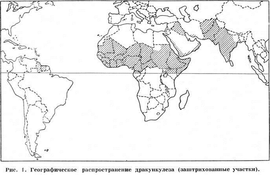 Существование очагов Дракункулез возможно лишь при наличии определённых природных и социально-бытовых факторов, среди последних наибольшее значение имеют особенности водопользования. Для поддержания очага Дракункулез необходимы следующие условия: наличие контакта больных Дракункулез с водоёмами, изобилующими циклопами; благоприятные условия для сохранения жизнеспособности попавших в воду личинок гельминта и их развития в циклопах до инвазионной стадии; употребление населением для питья необеззараженной воды. Заболеваемость дракункулезом в тропиках носит сезонный характер с подъёмом в сухой период. Болеют все возрастные группы населения, но дети младшего возраста заражаются Дракункулез крайне редко. Мужчины болеют Дракункулез чаще, чем женщины. ПатогенезВ основе патогенеза Дракункулез — сенсибилизация дефинитивного хозяина антигенами паразита и механическое воздействие гельминта на ткани. Клиническая картинаРанняя фаза Дракункулез не изучена. Для поздней фазы, наступающей через 9 — 14 месяцев после заражения, характерны крапивница, зуд, одутловатость лица, одышка и астмоидные явления, головокружение, слабость и другие Нередко наблюдаются аллергические отеки тканей в месте расположения паразита. Локализация может быть различной. Отеки обычно держатся от нескольких дней до 2½ месяцев; с появлением гельминта из-под кожи они исчезают или значительно уменьшаются. На коже соответственно месту головного конца гельминта формируется кожный элемент либо в виде волдыря до 2—7 сантиметров в диаметре, либо в виде псевдофурункула. Приблизительно через неделю кожный элемент вскрывается и обнажается подкожный ход, в котором располагается гельминт. Кутикула последнего вскоре лопается, и через образовавшееся отверстие выпячивается матка, которая разрывается и из неё вытекает молочного цвета жидкость, содержащая личинки. Подкожный ход гельминта (рисунок 3) удаётся наблюдать сравнительно редко, так как весь паразит или большая часть его располагается чаще в глубоких слоях подкожной клетчатки. По достижении гельминтом половой зрелости симптоматика во многом зависит от его локализации: описаны перикардит, плеврит, артриты, симптомы сдавления спинного мозга. В некоторых случаях наступает самоизлечение — гельминт погибает до прободения кожных покровов, затем рассасывается или обызвествляется. ОсложненияБольшинство из них возникает в результате присоединения вторичной бактериальной инфекции в месте расположения паразита. Описаны абсцессы, флегмоны, гангрены, трофические язвы, маститы, эпидидимиты, артриты и другие; при отсутствии своевременно начатого лечения может развиться сепсис. Другая группа осложнений связана с развитием аллергических проявлений, возникающих в результате обрыва гельминта и выхода большого количества личинок в окружающие ткани. При этом возникают аллергические отеки, синовиты, артриты и другие Диагноз заболевания прост лишь в случаях, когда виден подкожный ход червя, сформировался кожный элемент — волдырь или появился головной конец гельминта.