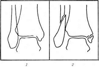 На рентгенограмме в прямой проекции при Дюпюитрена перелом хорошо видна линия перелома медиальной лодыжки, обычно проходящая на уровне суставной щели, а также латеральной лодыжки на уровне суставной щели или выше неё. Вместе с тем отчётливо выступают смещение отломков и возможный диастаз, то есть расхождение «вилки» сустава (рисунок 1 и 2). Для диагностики разрыва нижнего межберцового синдесмоза большое значение имеет сравнительное изучение переднезадних снимков (сделанных на одной плёнке) обоих голеностопных суставов в обычной укладке или с симметричной внутренней ротацией на 27°.