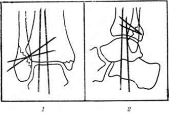 Для профилактики вторичного смещения в гипсовой повязке А. В. Каплан (1967) предложил метод трансартикулярной фиксации стопы и закрытый (чрескожный) остеосинтез спицами, заключающийся в том, что после ручной репозиции и наложения гипсовой повязки через окна в ней спицами Киршнера фиксируют голеностопный сустав, костные отломки и межберцовый синдесмоз (рисунок 3). Через 4—5 недель спицы удаляют, а гипсовую повязку оставляют на срок, необходимый для полной консолидации перелома.