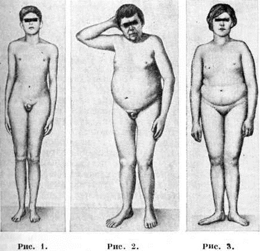 Выраженность Евнухоидизм в значительной мере зависит от того, в каком возрасте началось заболевание. Картину типичного Евнухоидизм даёт только допубертатное развитие недостаточности половых желёз. Чем старше становится ребёнок, тем отчётливее проявляются признаки Евнухоидизм Наряду с резким нарушением полового развития, чрезвычайно слабо выраженными вторичными половыми признаками для Евнухоидизм характерна диспропорция роста и ожирение (рисунок 1—3). В отдельных случаях может иметь место преобладание диспропорции скелета — длинные конечности при относительно коротком туловище, в других — ожирения, в третьих — сочетание того и другого. Отложение жира довольно типично: на груди в области молочных желёз, в нижней части живота, в области таза, на лобке.