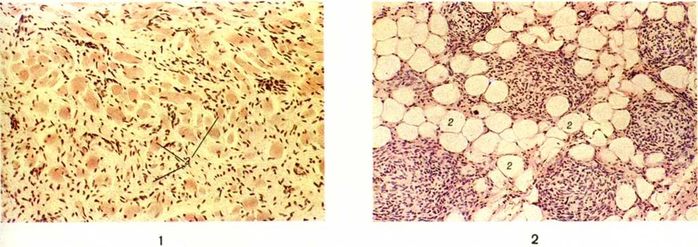 Поражение локализуется в подкожной клетчатке предплечья, плеча, подмышечной и ягодичной областей, может быть множественным. При микроскопическом исследовании выявляется характерная особенность — образование островков из незрелых мезенхимального вида клеток (цветной рисунок 2).