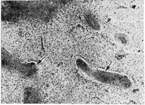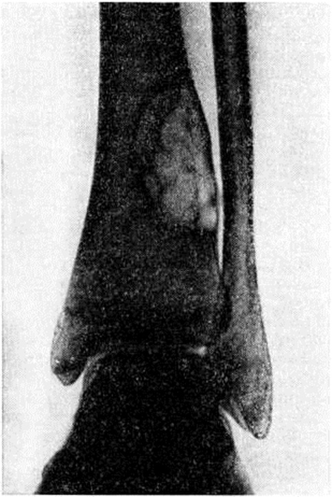 Отдельные кости подвергаются характерной деформации (рисунок 2). При локализации очага Фиброзная остеодисплазия в проксимальном конце бедра оно приобретает вид пастушьей палки с изгибом выпуклостью кнаружи, большой вертел поднимается вверх на уровень тела подвздошной кости; развивается варусная деформация бедра. Голени при их поражении изгибаются чаще кнаружи и кпереди. Плечевые кости булавовидно утолщаются в проксимальных отделах. Поражение костей таза сопровождается деформацией тазового кольца, позвонков, рёбер, грудной клетки. Поражение костей черепа и их деформация вызывают асимметрию и обезображивание лица, вторичные нарушения зрения и слуха, головные боли, экзофтальм (смотри полный свод знаний). Деформации костей усугубляются неправильно сросшимися патологический переломами. Почти постоянным симптомом Фиброзная остеодисплазия костей нижней конечности является хромота (смотри полный свод знаний), от лёгкого прихрамывания до выраженного нарушения походки. Функциональная неполноценность конечности сопровождается атрофией мягких тканей, вторичными деформациями суставов, позвоночника. Полиоссальная форма Фиброзная остеодисплазия часто сочетается с патологический кожной пигментацией (пятна различной величины и формы всех оттенков коричневого цвета), ранним половым созреванием (смотри полный свод знаний), гипертиреозом (смотри полный свод знаний: Тиреотоксикоз). Костные изменения, пигментация кожи и преждевременное половое созревание у женщин — триада признаков, известных как синдром, или болезнь, Олбрайта (смотри полный свод знаний: Псевдогипопаратиреоз). Прогрессирование Фиброзная остеодисплазия заканчивается с половым созреванием. Диагноз устанавливают на основании клинические, картины и типичных рентгенологическое данных. Ведущими рентгенологическое признаками Фиброзная остеодисплазия являются очаг разрежения и зона диффузного просветления костной ткани. В соответствии с этим принято различать две рентгенологическое формы Фиброзная остеодисплазия: очаговую и диффузную. Граница между ними, однако, не всегда отчётлива, возможны смешанные формы. При очаговой форме Фиброзная остеодисплазия обнаруживают участки ограниченного просветления костной ткани, располагающиеся эксцентрически в области коркового (компактного) вещества кости. Первоначально возникающие узлы чётко отграничены друг от друга скорлупообразной уплотнённой полоской костной ткани. По мере развития заболевания размеры очагов увеличиваются; обнаруживается истончение коркового вещества, которое приобретает неровные серповидные или фестончатые очертания. Кость как бы вздувается изнутри, становится бугристой. Иногда выявляют одновременно несколько изолированных очагов Фиброзная остеодисплазия, которые нечётко отграничены друг от друга, но все же сохраняют относительную самостоятельность; при этом кость приобретает крупноячеистый вид (рисунок 3). Корковое вещество её резко истончается за счёт эндостальной резорбции. Поперечник кости на значительном протяжении неравномерно утолщается. В некоторых случаях очаги Фиброзная остеодисплазия определяются в виде отдельных гнездных образований, разбросанных по длиннику кости среди неизменённой или малоизменённой, в основном склерозированной, костной ткани. Структур