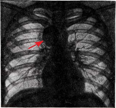 Рентгенологическая картина Ганглионеврома зависит от её локализации. Наиболее часто объектом рентгенологическое исследования является Ганглионеврома, растущая из элементов пограничного симпатического ствола и проникающая в паравертебральный отдел заднего средостения. На прямой рентгенограмме Ганглионеврома заднего средостения даёт однородное различных размеров затемнение полукруглой или полуовальной формы, тесно примыкающее к тени позвоночника. Очертания тени Ганглионеврома обычно чёткие и ровные (рисунок 2). В боковой проекции для Ганглионеврома характерна непосредственная близость к тени позвоночных концов рёбер. При затруднении определения локализации Ганглионеврома могут быть применены пневмомедиастинография (смотри) или искусственный пневмоторакс (смотри Пневмоторакс искусственный).