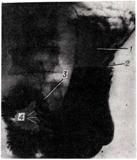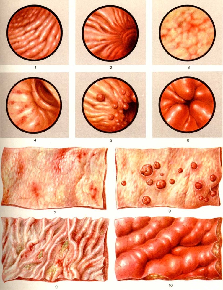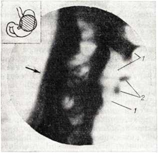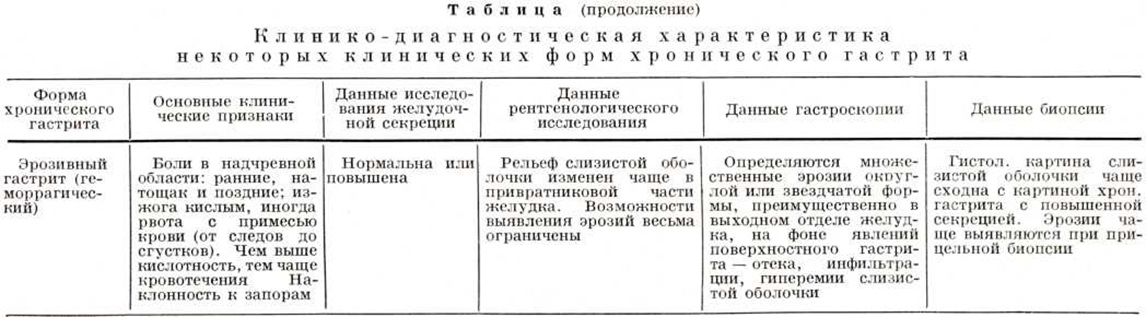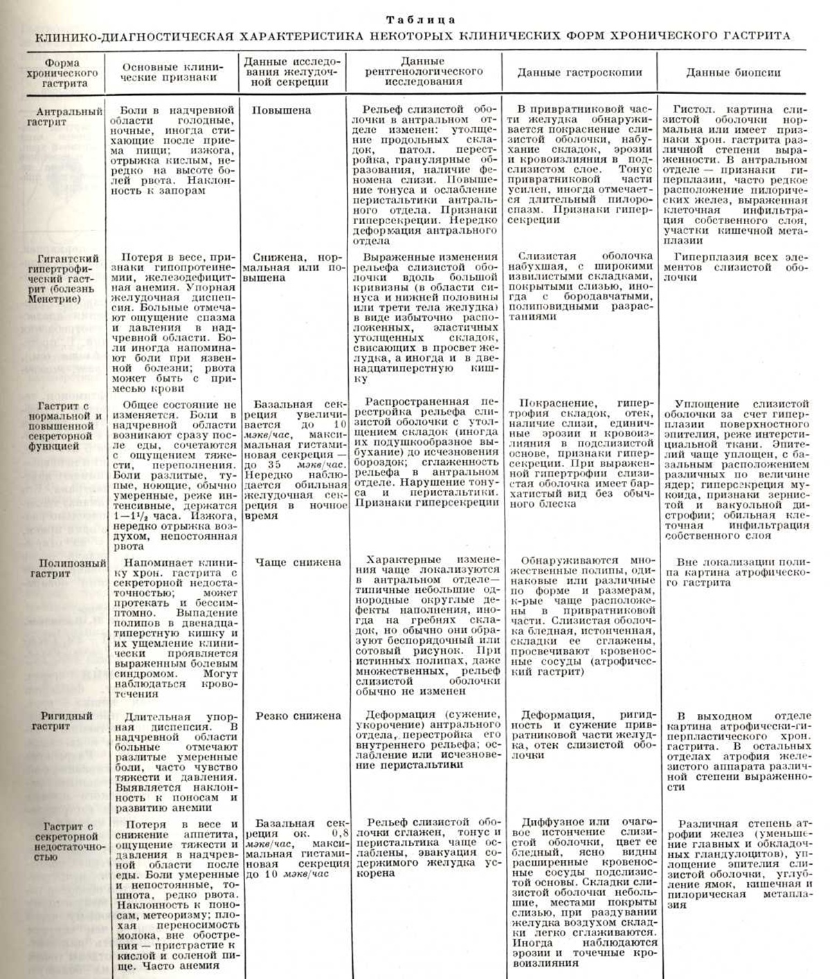 Ригидный гастрит впервые описан А. Н. Рыжих и Ю. Н. Соколовым (1947). Он проявляется упорной диспепсией (смотри) и ахлоргидрией (смотри). Диагноз устанавливается при рентгенологическое исследовании и на основании данных гастроскопии. Преимущественно поражается выходной отдел желудка, который вследствие гипертрофических изменений, отёка и спастического сокращения мускулатуры деформируется, превращаясь в узкий трубообразный канал с плотными ригидными стенками. Полипозный гастрит (цветной рисунок 8) развивается обычно на фоне атрофического Гастрит с гистаминрефрактерной ахлоргидрией, его можно рассматривать как дальнейшее прогрессирование хронический Гастрит (дисрегенераторная гиперплазия слизистой оболочки). Гигантский гипертрофический гастрит или точнее избыточное развитие слизистой оболочки, описанный Менетрие (P. Menetrier, 1886),— относительно редкое заболевание, проявляющееся нарушением обмена веществ (чаще белкового) и очень редко развитием железодефицитной анемии. Изменение кислотообразующей функции желудка бывает различным (смотри также таблица). Диагноз основывается на анализе клин, проявлений болезни, результатах исследования желудочной секреции (смотри Желудок, методы исследования), рентгенологическое исследования, данных гастроскопии (смотри) и гастробиопсии. В оценке морфологически картины слизистой оболочки желудка следует отдавать предпочтение данным гастробиопсии. Эксфолиативная цитодиагностика, определение всасывательной и экскреторной функции желудка имеют второстепенное значение. Определённые трудности возникают при дифференциальной диагностике с функциональными нарушениями желудка, раком желудка (смотри Желудок, опухоли) и язвенной болезнью (смотри). При функциональных нарушениях желудка обычно нет резких морфологически изменений. Кроме того, они имеют относительно кратковременное (до 1 года) течение, меньшую зависимость возникновения болей от приёма пищи, большую изменчивость клинической проявлений, что связано с нервно-психическими влияниями, атипичную локализацию болезненности при пальпации живота и, наконец, резкое колебание кислотности при отдельных исследованиях. Рентгенодиагностика основывается на тщательном рентгенологическое исследовании желудка. При этом определяются перестройки рельефа слизистой оболочки желудка и другие рентгено-функциональные и морфологически симптомы. К ним относятся: избыточная секреция натощак, быстрое нарастание секреторной жидкости, изменения тонуса, стойкая деформация привратниковой части желудка, нарушение перистальтики и другие. Наиболее постоянен симптом увеличенной секреции натощак, проявляющийся иногда горизонтальным уровнем жидкости на фоне желудочного пузыря до приёма бариевой взвеси. Первые один-два глотка взвеси бария подтверждают наличие избытка жидкости. По характеру смешивания бария с жидкостью можно до известной степени судить о количестве содержащейся в ней слизи: медленное смешивание с образованием бесформенных хлопьев указывает на наличие слизи. Другим симптомом наличия слизи (феномен слизи) являются мелкоточечные просветления в слое бариевой взвеси — мельчайшие капельки слизи, взвешенные в суспензии бария. Феномен слизи неразличим при просвечивании и может быть констатирован только на снимках с компрессие