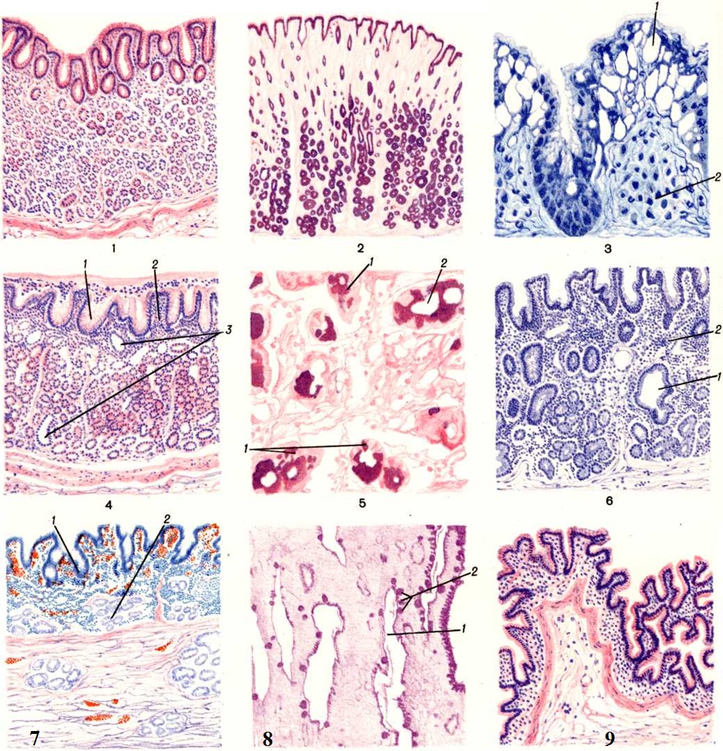 При хроническом гастрите с поражением желёз поверхностный эпителий слизистой оболочки уплощён, отмечается углубление желудочных ямочек, добавочные гландулоциты гиперплазированы. В главных гландулоцитах выявляются вакуоли (рисунок 1), содержащие нейтральные мукополисахариды (цветной рисунок 5). В цитоплазме этих клеток, среди гранул зимогена, обнаруживаются бесформенные массы, местами окружённые мембраной. Эти массы сходны с «незрелым» или «зрелым» мукоидом. В надъядерной зоне выявляется развитый пластинчатый комплекс (Гольджи) с расширенными цистернами (рисунок 2). Таким образом, в этих клетках обнаруживаются элементы как главных (зимоген, РНК, эргастоплазма), так и добавочных гландулоцитов (нейтральные мукополисахариды, хорошо развитый пластинчатый комплекс). Эти клетки являются, по-видимому, незрелыми главными гландулоцитами перешеечного отдела желудочных желёз. В результате замедления их дифференциации они занимают территорию зрелых главных гландулоцитов. Добавочные гландулоциты также «незрелые», с развитым пластинчатым комплексом и эргастоплазмой; обнаруживаются они в тех отделах желёз, где обычно не наблюдаются. Хронический атрофический гастрит характеризуется уменьшением (иногда значительным) числа главных и добавочных гландулоцитов, углублением желудочных ямочек (цветной рисунок 7 и цветной рисунок 6 и 7), которые часто имеют штопорообразный вид (рисунок 3), гиперплазией добавочных гландулоцитов. Эпителий, покрывающий желудочные поля и ямочки, нередко уплощён, содержит много РНК и мало нейтральных мукополисахаридов, местами замещён кишечным эпителием (цветной рисунок 8) с типичными энтероцитами, бокаловидными клетками и клетками Панета (кишечная метаплазия). Желудочные железы нередко заменены слизистыми (пилорическая метаплазия). Сохранившиеся главные гландулоциты вакуолизированы, в обкладочных гландулоцитах выявляется разрежение цитоплазмы в перинуклеарной зоне и вокруг внутриклеточных канальцев, а также уменьшение количества микроворсинок и тубуловезикул; отмечается редукция крист митохондрий обкладочных гландулоцитов. Вольф (G. Wolf, 1968) выделяет три стадии атрофии слизистой оболочки желудка: начинающуюся атрофию, при которой железы ещё не укорочены, но выглядят как бы сдавленными; частичную атрофию (желёз), при к-рой сохранены группы желёз, содержащие главные и париетальные (обкладочные) гландулоциты; тотальную атрофию желёз (атрофия слизистой оболочки), когда главные и париетальные (обкладочные) гландулоциты не выявляются, железы выстланы только слизеобразующим эпителием. Хронический гипертрофический гастрит — утолщение слизистой оболочки и усиленная пролиферация эпителия (цветной рисунок 6, 9 и рисунок 7). Различают три формы хронический гипертрофического Гастрит: интерстициальную, пролиферативную, железистую. Для интерстициальной формы характерна обильная лимфоплазмоцитарная инфильтрация, встречающаяся в краях язв; для пролиферативной — разрастание поверхностного эпителия, углубление ямочек, железистый аппарат без изменений; при железистой форме слизистая оболочка утолщена в 2—7 раз за счет гиперплазии желёз; эта форма хронический Гастрит встречается при язве двенадцатиперстной кишки (смотри Язвенная болезнь), синдроме Золлингера — Эллисона (смотри Золлингера — Эллисона си