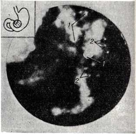При полипозном (бородавчатом) Гастрит патологический изменения часто локализуются в антральном отделе. Они представляют собой множественные однородные по величине, округлые, не резко очерченные дефекты диаметром 3—5 миллиметров, иногда в виде возвышений на гребнях складок, но чаще образующие беспорядочный или сотовый рисунок (рисунок 10). При истинных полипах, даже множественных, рельеф слизистой оболочки желудка обычно не изменён. При полипозном Гастрит, как правило, обнаруживаются и другие рентгенологическое симптомы. При более мелких разрастаниях Гастрит называется бородавчатым, или веррукозным; мелкие дефекты обычно распознаются только на прицельных снимках с компрессией. Гранулярный гастрит распознается по симптому «зернистости» рельефа (рисунок 11). Этот симптом изучался Фриком (W. Frik) с помощью снимков рельефа острофокусной рентгеновской трубки при коротких выдержках (не более 0,1 секунд). При этом создаётся впечатление зернистой поверхности слизистой оболочки с мельчайшими возвышениями — так называемый желудочные поля. Сопоставление данных исследования «тонкого рельефа» с результатами гастробиопсии обнаружило параллелизм между картиной желудочных полей и наличием воспалительных изменений слизистой оболочки. Если в нормальных условиях диаметры полей составляют ½—1½ миллиметров, то при хронический Гастрит желудочные поля становятся более выпуклыми — «зернистый» тип, а в далеко зашедших случаях — и более крупными (диаметром 3 миллиметров и более), неравномерными, напоминающими бородавчатую поверхность. Наряду с этим симптомом необходимо обнаружить и другие вышеописанные рентгенологическое признаки Гастрит. Эрозивный Гастрит редко распознается рентгенологически, так как возможности выявления эрозий рентгенологическое методом исследования весьма ограничены. Так называемый сопровождающий (сопутствующий) Гастрит рентгенологически постоянно обнаруживается при язвенной болезни (исключение составляют так наз. старческие язвы желудка) и реже при раке желудка. Выраженные картины сопровождающего Гастрит наблюдаются при язве двенадцатиперстной кишки, после операции гастроэнтеростомии. При сопровождающем Гастрит чаще поражается выходная часть желудка. Наблюдаются и все вышеописанные рентгенологическое симптомы Гастрит. Нередко отмечается грубый рисунок рельефа слизистой оболочки, беспорядочность и набухание складок. Динамические клин.-рентгенологическое наблюдения за течением сопровождающего Гастрит при язвенной болезни показывают, что если под влиянием консервативного лечения язвенная «ниша» исчезает, а другие рентгенологическое симптомы Гастрит остаются без изменений, то, как правило, больные не отмечают улучшения. При рентгенологическое исследовании известные трудности может представлять распознавание полипозного Гастрит., который следует дифференцировать с истинными полипами желудка. При диагностике хронический антрального Гастрит необходимо иметь в виду также пернициозную анемию, при которой могут наблюдаться полиморфные изменения рельефа слизистой оболочки привратниковой части желудка. Кроме ригидного антрального гастрита, необходимо принимать во внимание и другие виды антральных Гастрит с резкой перестройкой рельефа слизистой оболочки, который иногда неотличим от ат