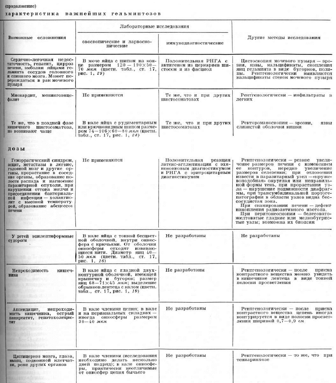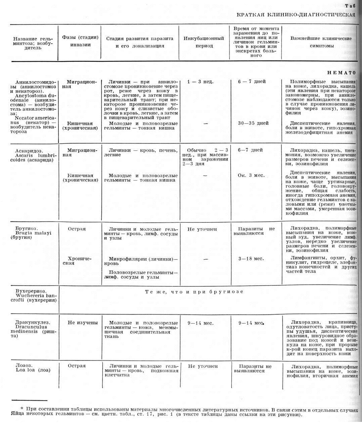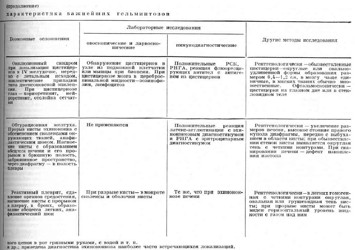 Широкое распространение Гельминтозы в тропической зоне объясняется и относительно низким экономическим уровнем, недостаточной организацией лечебно-профилактические по мощи населению в развивающихся странах. Гименолепидоз и энтеробиоз распространены повсеместно. ЭтиологияВажнейшие Гельминтозы человека вызываются паразитическими червями, относящимися к классам Trematoda (сосальщики), Cestoda (ленточные черви) и Nematoda (круглые черви). В соответствии с этим различают трематодозы (смотри), цестодозы (смотри), нематодозы (смотри). Известны случаи паразитирования у человека червей типа Annelida (кольчатые черви) и Acanthocephala — скребни, или колючеголовые (смотри Акантоцефалезы). ЭпидемиологияИсточником заражения Гельминтозы является человек, а при гельминтозоонозах также домашние и дикие животные. В зависимости от факторов передачи Гельминтозы разделяют на две основные группы: геогельминтозы и биогельминтозы. Яйца или личинки возбудителей геогельминтозов выделяются больным с фекалиями во внешнюю среду, где они созревают и становятся инвазионными. Факторами передачи служат загрязнённые личинками или яйцами геогельминтов почва, вода, пища, игрушки, предметы обихода и руки. К геогельминтозам относятся аскаридоз, трихоцефалез, анкилостомидозы, стронгилоидоз и другие. Возбудители биогельминтозов в своём развитии, помимо окончательного (дефинитивного) хозяина, нуждаются в промежуточном, а иногда и дополнительном хозяине, в организме которых паразитируют личиночные стадии гельминтов (смотри Хозяин паразита). В организме дефинитивных хозяев биогельминты достигают половой зрелости. Например, дефинитивным хозяином возбудителя тениаринхоза — бычьего цепня — является человек, промежуточным хозяином — крупный рогатый скот. Больной тениаринхозом выделяет с фекалиями яйца и членики бычьего цепня, содержащие большое количество зрелых яиц. У животного, проглотившего яйца бычьего цепня с кормом или водой, в мышцах развиваются личинки — цистицерки (финны). Человек заражается тениаринхозом при употреблении в пищу сырого или недостаточно термически обработанного финнозного мяса. Возбудитель дифиллоботриоза — широкий лентец, кроме дефинитивных хозяев — человека, кошки, собаки и другие, имеет хозяев промежуточных (рачков-циклопов и другие.) и дополнительных (рыб — щуку, окуня, налима и другие.). Заражение дифиллоботриозом происходит при употреблении в пищу сырой или недостаточно термически обработанной рыбы либо не просоленной икры с личинками лентеца. К биогельминтозам также относятся тениоз, описторхоз, клонорхоз, метагонимоз, парагонимоз, фасциолез, фасциолопсидоз, дикроцелиоз, шистосоматозы, филяриатозы, трихинеллёз и другие. Для трихинеллы характерно, что все стадии её развития проходят в одном хозяине — человеке, домашних и диких млеко питающих. Для возбудителя же гименолепидоза — карликового цепня — дефинитивным и промежуточным хозяином является человек: половозрелые гельминты паразитируют в просвете кишечника, личинки — в ворсинках. Гельминтозы, возбудители которых могут паразитировать и у человека, и у животных, называют гельминтозоонозами. К ним относятся трихинеллёз, эхинококкоз, альвеококкоз, описторхоз, клонорхоз, фасциолез, японский шистосоматоз, бругиоз и другие. Гельминтозоонозы, которые существуют и распростра