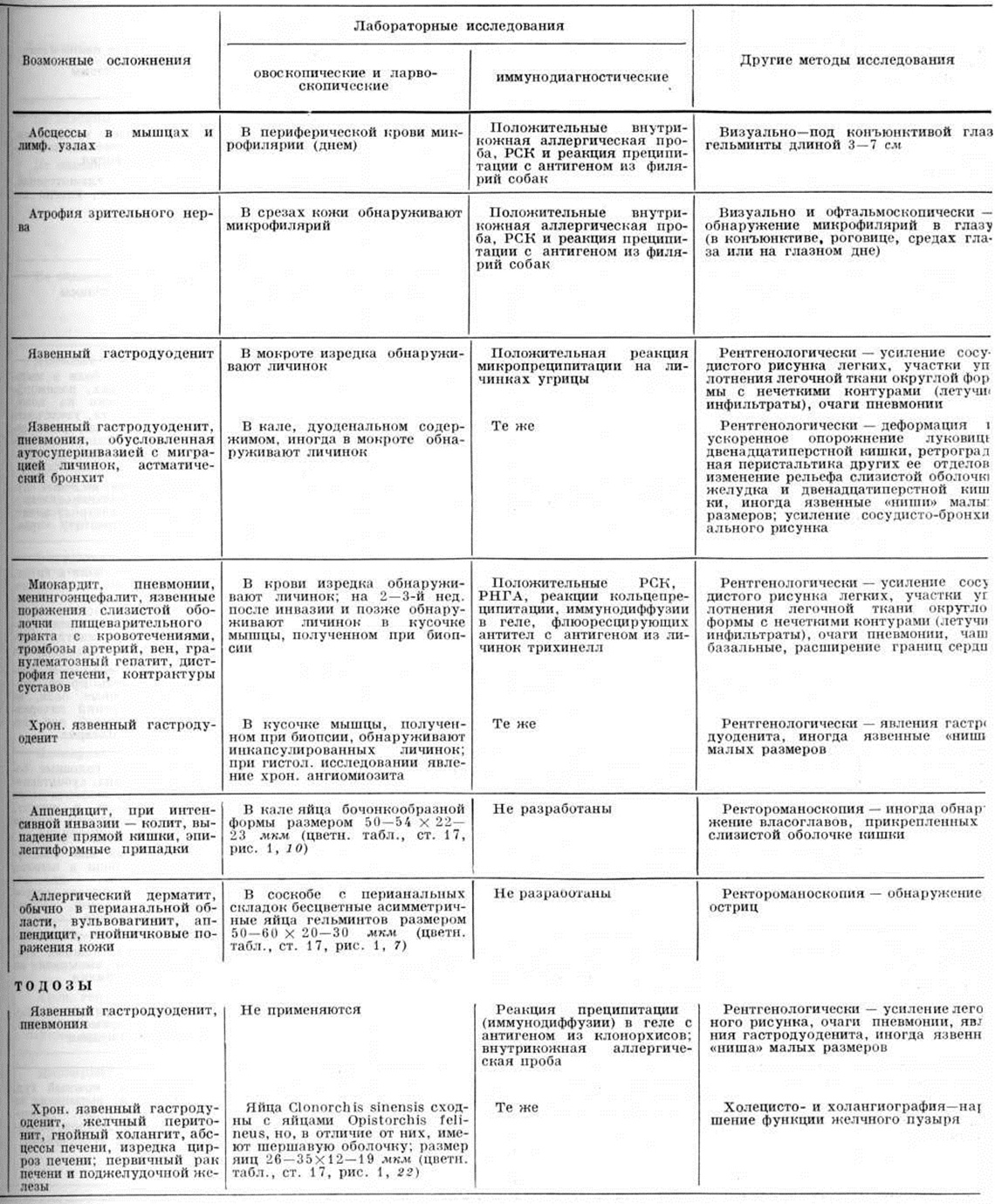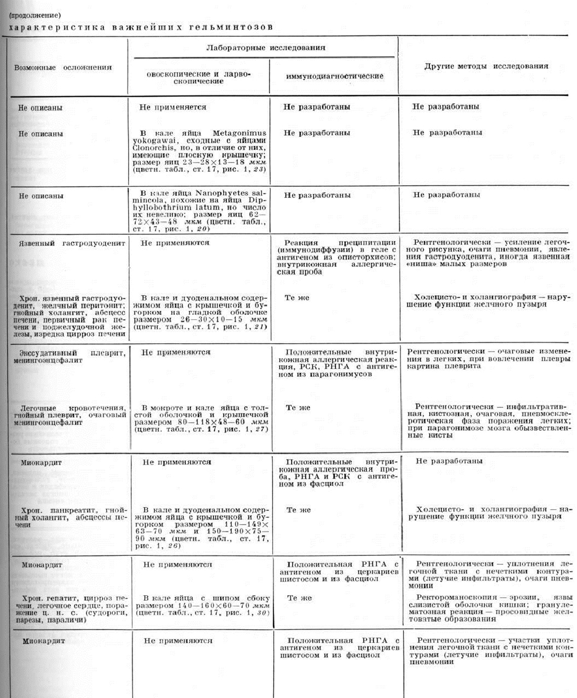 При Гельминтозы, возбудители которых повторно откладывают живых личинок, например, при стронгилоидозе, филяриатозах, общеаллергические явления закономерно возникают и в хронический фазе болезни. Крапивница, гиперэозинофилия крови, анафилактические реакции особенно характерны для ларвальных (личиночных) Гельминтозы, при которых человек является промежуточным хозяином, например, для эхинококкоза, larva migrans (смотри). Существенную роль в патогенезе Гельминтозы играет диспротеиноз и тяжёлые дистрофические процессы, развивающиеся в результате массивного антигенного воздействия паразитов на организм хозяина (жировая дистрофия печени при трихинеллёзе, системный амилоидоз при альвеококкозе и множественном эхинококкозе печени и другие.). Помимо иммунологический механизмов, к неспецифическим факторам воздействия гельминтов следует отнести прямое действие ферментов, выделяемых мигрирующими личинками, — гиалуронидазы, коллагеназы, холинэстеразы, пептидаз, липолитических ферментов. В хронический фазе Гельминтозы наряду с сенсибилизирующим воздействием паразитов на организм существенную роль играет механический фактор, например, нарушение оттока желчи при размещении кисты эхинококка или узла альвеококка в воротах печени, окклюзионный синдром при перемещении цистицерков в желудочках мозга, травматизация слизистой оболочки кишечника фиксирующим аппаратом гельминтов. К специфическому воздействию гельминтов следует отнести способность широкого лентеца поглощать из кишечника хозяина витамин В12, при кровососании — кровь, кислород и железо, что служит причиной развития пернициозоподобной анемии, а также заимствование гельминтами кислорода и железа в процессе окислительного фосфорилирования. Течение заболевания при Гельминтозы за висит от массивности инвазии, штаммовых особенностей паразитов, общего состояния организма хозяина, особенностей его профессии, определяющих нередко путь заражения Гельминтозы. Отягощающее влияние Гельминтозы на течение инфекций вызвано действием антигенов гельминтов, что способствует, с одной стороны, сенсибилизации (смотри), а с другой стороны, подавлению формирования иммунитета. Патологическая анатомияПатоморфологические изменения во внутренних органах в острой Гельминтозы характеризуются пролиферацией лимфоидных элементов, макро фагов, плазматических, тучных клеток, гранулематозом, эозинофильной реакцией, васкулитами. При ранних летальных исходах (2—3 недель после заражения) преобладают геморрагически-альтеративные поражения, в более поздние сроки (4— 6 недель) — гранулематоз или диффузная эозинофильная инфильтрация поражённого органа (миокардит, пневмонит, гепатит, энцефалит), системные васкулиты, тромбогеморрагический синдром. ИммунитетЗаболевание Гельминтозы вызывает у человека и животных специфические защитные реакции клеточного и гуморального характера. Иммунитет (смотри) при Гельминтозы проявляется ограничением репродуктивной активности и удалением из кишечника зрелых гельминтов (аскарид, трихинелл и другие.), подавлением жизнеспособности, гибелью и резорбцией тканевых личиночных форм (трихинелл, эхинококков, альвеококков), невосприимчивостью к суперинвазии. Антитела при Гельминтозы высокоспецифичны не только по отношению к видам, но также и стадиям р