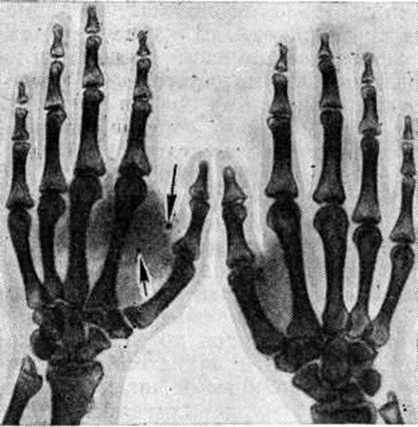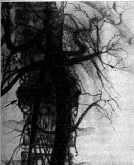 Нередко вторичное вовлечение кости при первичной Гемангиома мягких тканей (рисунок 3); на фоне клинически и рентгенологически выявляемого увеличения объёма мягких тканей определяются типичные мелкие (костной плотности) образования — ангиолиты. Иногда наблюдается истончение участка кости, соприкасающегося с опухолью от давления, причём остеопороз, как правило, отсутствует. При прорастании Гемангиома в кость в зоне её внедрения наблюдается развитие центральных и краевых дефектов, окружённых склеротической каймой. При Гемангиома мягких тканей предплечья и голени обычно наблюдается вовлечение в процесс обеих костей на уровне локализации Гемангиома. Рентгенологическое исследование подтверждает диагноз Гемангиома, выявляя в мягких тканях характерные тени ангиолитов. Дифференциально-диагностические трудности, возникающие при глубоком расположении Гемангиома в мягких тканях, могут быть разрешены при помощи ангиографии (рисунок 4). ЛечениеПри Гемангиома с прогрессирующим течением применяются следую щие методы лечения: хирургический, криотерапия, инъекции склерозирующих веществ, электрокоагуляция, лучевая терапия. Хирургический метод лечения наиболее распространён и чаще применяется при Гемангиома кожи и под кожной клетчатки туловища и конечностей; он также используется в ряде случаев при Гемангиома мышц и внутренних органов (печень, кишечник и другие.). Гемангиома, как правило, должна удаляться в раннем детском возрасте, пока она ещё не разрослась. Раннее иссечение опухоли даёт хороший косметический результат и позволяет избежать осложнений в виде изъязвлений и инфекции. Применяют следующие виды хирургического лечения: иссечение Гемангиома, частичное удаление её с наложением швов через кожу. Иссечение является наиболее простым и радикальным методом. Операция показана в тех случаях, когда её можно выполнить без косметического дефекта и риска нарушить функции органа или конечности. В зависимости от локализации очага поражения и его размеров оперативное вмешательство производится под местной анестезией либо под наркозом. Очерчивающим разрезом (чаще овальным) Гемангиома иссекают вместе с прилежащей клетчаткой. При иссечении Гемангиома, располагающейся на конечностях, целесообразно пользоваться жгутом. В тех случаях, когда жгут наложить не возможно, помощник прижимает края раны для уменьшения кровотечения. Кровотечение бывает особенно сильным в тех случаях, когда разрез прошёл в пределах опухоли. При расположении Гемангиома в клетчатке целесообразно иссекать её из-под кожи, стараясь сохранить последнюю. Такой приём позволяет избежать натяжения кожи во время зашивания и даёт хороший косметический результат. При больших Гемангиома образующийся после иссечения дефект закрывают свободной кожной пластикой. При значительных кровопотерях переливают кровь.