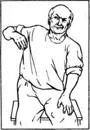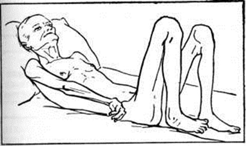 Прогрессирующая гемиплегия возникает при протрагированном течении патологический процесса. Для неё характерны вынужденное положение конечностей, контрактуры, различные по форме (сгибательные, разгибательные, пронаторные), по локализации (контрактуры кисти, стопы), по способу проявления (стойкие, в виде тонических спазмов), по времени возникновения (ранние и поздние). Гиперпронаторная контрактура характеризуется гемигиперпронацией кисти с разгибанием или чрезмерным сгибанием пальцев, резкой гипертонией в пронаторах (рисунок 3). Гиперсупинаторная контрактура парализованной руки характеризуется чрезмерной супинацией предплечья и кисти. Своеобразные контрактуры с вычурной позой конечностей наблюдаются при поражении подкорковых узлов: указательная контрактура (указательного и среднего пальцев); «таламическая» кисть с гиперэкстензией пальцев в основных фалангах; гиперсупинаторная контрактура с резкой супинацией стопы; гемифлексорная гемиплегическая контрактура (сгибание верхней и нижней конечностей на парализованной стороне) в сочетании со сгибанием голени и бедра, абдукцией или реже гипер аддукцией. К поздним гемиплегическим контрактурам относится контрактура Вернике — Манна, возникающая вследствие длительного сохранения позы Вернике — Манна: верхняя конечность приведена к туловищу, надплечье опущено, предплечье согнуто, пронировано, кисть и пальцы умеренно согнуты, нижняя конечность приведена, бедро и голень разогнуты, стопа повёрнута внутрь. Регрессирующая гемиплегия проявляется в реституционном периоде заболевания. Она характеризуется последовательным восстановлением нарушенных движений. Функция парализованной ноги обычно восстанавливается быстрее, чем руки, движения в проксимальном отделе конечностей появляются раньше, чем в дистальном. Особенно поздно идёт восстановление наиболее дифференцированных движений пальцев руки. Функция разгибания кисти и пальцев значительно отстаёт от сгибательной, в результате чего преобладают сгибательные синергии при содружественных движениях и сгибательная поза при контрактурах. Движения в проксимальном отделе восстанавливаются довольно быстро, поскольку в реализации их участвует не только пирамидная, но и экстрапирамидная система. Походка при спастической регрессирующей Гемиплегия своеобразна: нога заносится вперёд и кнаружи, как бы описывая полукруг или движение, которое делает косарь («косящая походка»), стопа при этом находится в разогнутом положении и при ходьбе носком задевает за пол. Восстанавливающиеся нарушенные движения вначале бывают дискоординированными, выполняются с усилием и сопровождаются синкинезиями. В процессе восстановления моторики вначале нарастает тонус мышц, появляются содружественные движения в этих мышцах. Раньше появляются синкинезии: сгибание и пронация кисти, предплечья (рисунок 4) и отведение руки и разгибание бедра, голени и стопы. Затем появляются содружественные движения стопы (синкинезия Штрюмпелля) или большого пальца (синкинезия Логра) при попытке больного активно согнуть ногу в коленном суставе, аддукторная и абдукторная синкинезии Раймиста, сгибание голени на стороне Гемиплегия при наклоне туловища вперёд и другие синкинезии.