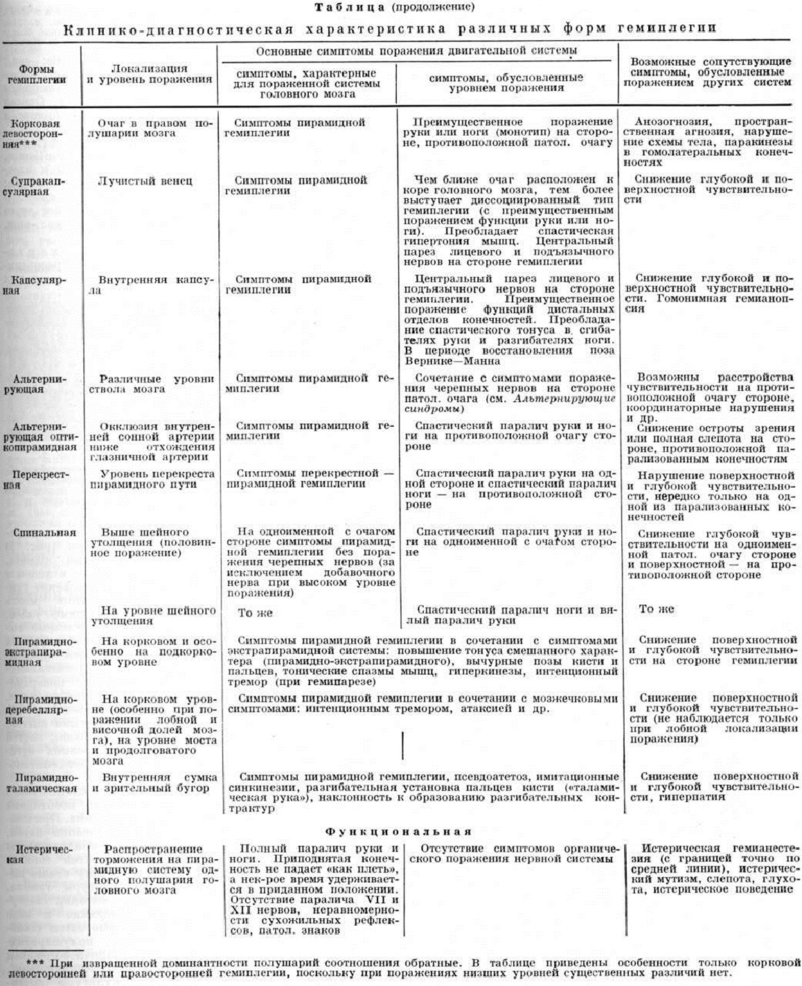 На ЭМГ обнаруживаются изменения, характерные для центрального паралича, при исследовании электровозбудимости отсутствует реакция перерождения. При длительно существующей Гемиплегия развивается нерезкая атрофия мышц. Наблюдаются также вегетативные расстройства (вазомоторные, трофические, пиломоторные, нарушение кожной температуры, потоотделения и другие.). В гемиплегический и гемипаретический симптомокомплексы входят ограничение или отсутствие движений, снижение силы мышц, изменение мышечного тонуса, патологический синкинезии и защитные рефлексы. Гемиплегия имеет различные варианты в зависимости от локализации поражения (таблица), стадии и характера патологический процесса и этиологии заболевания. Развитие Гемиплегия и выраженность нарушения двигательных функций и их динамика зависят от величины и глубины повреждения пирамидной системы и компенсаторных возможностей. Чем ограниченнее очаг поражения и чем ближе он расположен к коре, тем больше условий для появления пареза, а не паралича. В зависимости от локализации поражения различают следующие формы Гемиплегия. Корковая гемиплегия возникает при поражении двигательной области коры головного мозга; при поражении верхнего отдела передней центральной извилины и парацентральной дольки (круральная Гемиплегия) преимущественно нарушается функция ноги, при поражении нижнего отдела — функция руки и мышц лица и языка (брахиоцефальная Гемиплегия). В этих случаях можно говорить о гемипарезе, поскольку полного паралича не наблюдается. При поражении верхних двух слоёв коры в области передней центральной извилины возникает супрануклеарная Гемиплегия, которая характеризуется быстрым восстановлением функций. При поражении всех шести слоёв Гемиплегия бывает более выражена, и восстановление происходит медленнее. Корковая Гемиплегия, возникающая при поражении премоторной области, характеризуется ранней спастичностью, сухожильной гиперрефлексией, клонусом стопы, кисти, пальцев, глобальной синкинезией, ротацией стопы внутрь, координаторными синкинезиями, рефлексом Россолимо, шейно-тоническими рефлексами и другие, реституция идёт быстрее, чем при поражении поля 4. Правосторонняя корковая Гемиплегия при распространении поражения на задний отдел лобной доли или височную долю левого полушария сочетается нередко с нарушением речи и письма (у правшей). Супракапсулярная гемиплегия отличается склонностью к диссоциированному типу при локализации очага вблизи коры больших полушарий и относительно равномерным поражением руки и ноги при локализации очага ближе к внутренней капсуле. Пирамидно экстрапирамидная гемиплегия (корково-подкорковая) проявляется симптомами центрального паралича в сочетании с симптомами поражения экстрапирамидной системы, вычурными позами кисти и пальцев, тоническими спазмами («подвижные» контрактуры), гиперкинезами (хореиформные, атетоидные, гемибаллические, миоклонические), пластической гипертонией, иногда «автоматизированной жестикуляцией» в гомолатеральных очагу конечностях. Пирамидно-церебеллярная гемиплегия характеризуется сочетанием признаков Гемиплегия с мозжечковыми расстройствами. Пирамидноталамическая гемиплегия. Поражение пирамидного пути и зрительного бугра вызывает Гемиплегия в сочетании с гиперпатией и избыт
